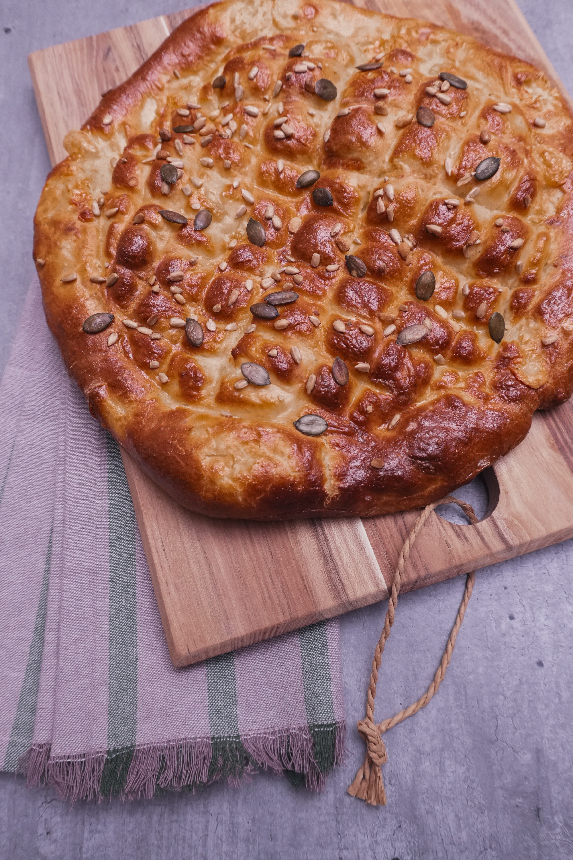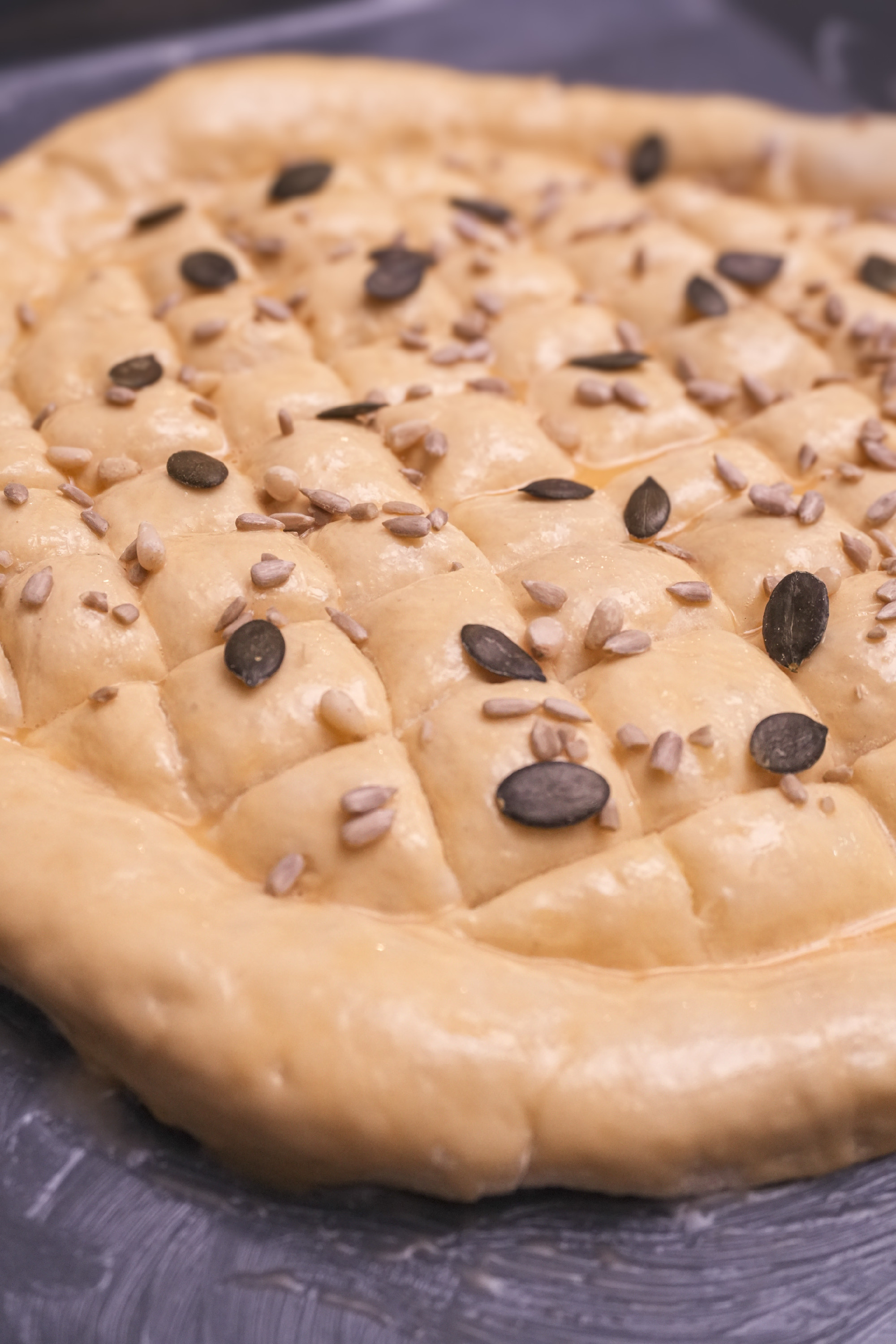 A tetejét lekenjük a felvert tojással, megszórjuk magokkal, majd hagyjuk még 10 percet pihenni. Végül 180 °C-ra előmelegített sütőben aranybarnára sütjük. Körülbelül 25-30 perc alatt készül el.