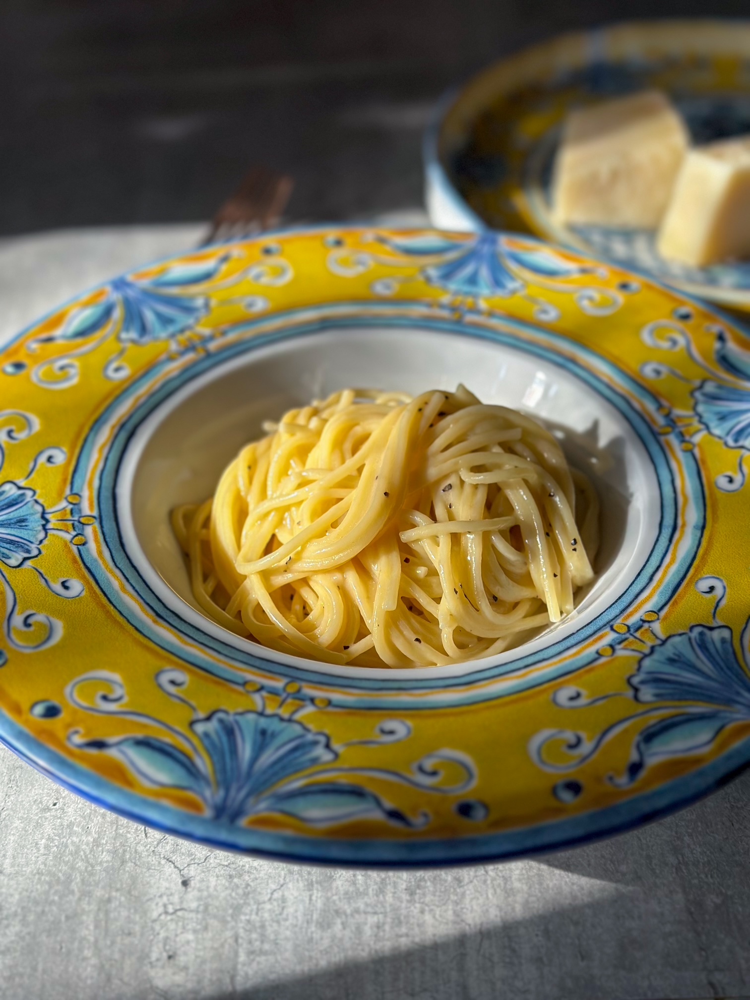 A Pecorino Romano jellegzetes olasz sajt és az őrölt fekete bors szerencsés találkozását a tésztával az olasz pásztoroknak köszönhetjük, és nem véletlenül tartozik a cacio e pepe az olasz konyha ikonikus fogásai közé. nevének jelentése sajt és bors, vagyis éppen az étel lényegét ragadja meg elnevezése. Az eredetileg Olaszország Lazio régiójából származó fogás tonnarellivel vagy spagettivel készül, és a 18-19. századra datálják keletkezését:
