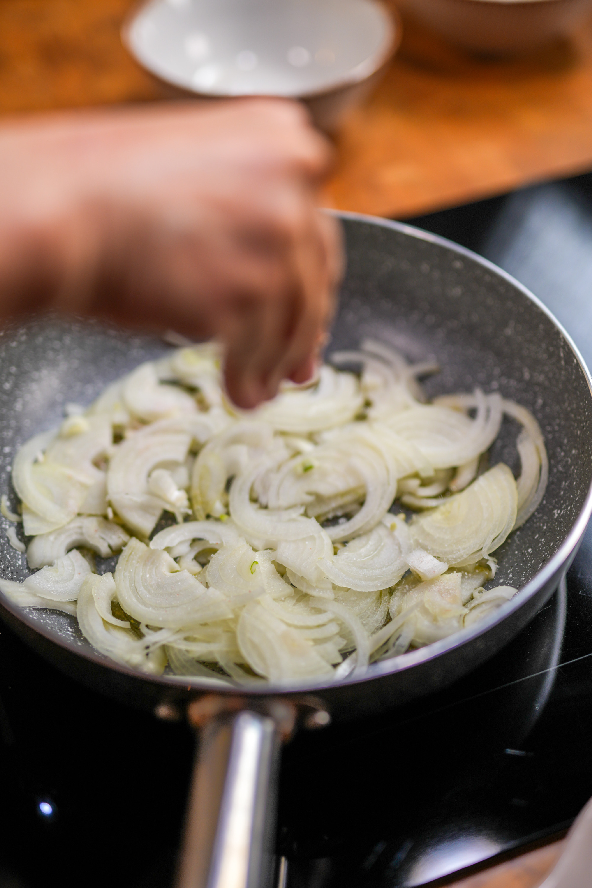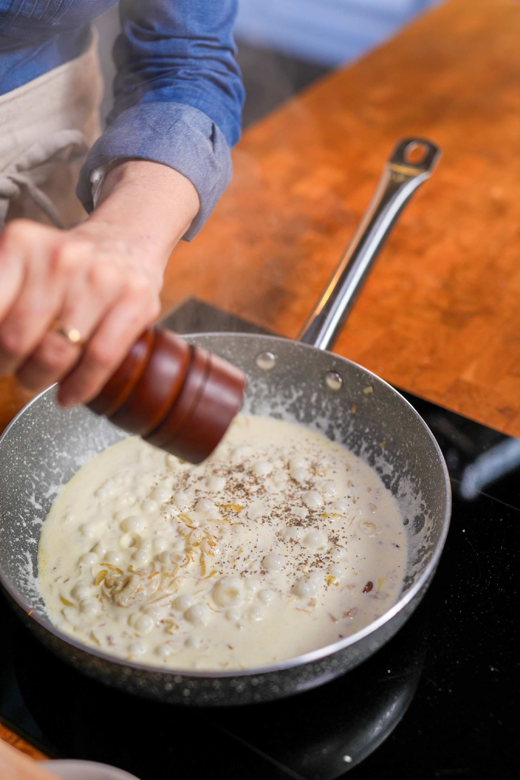 A mártáshoz a hagymát vékonyra szeleteljük, majd olívaolajon lassan karamellizáljuk. Amikor szép aranybarna, hozzáadjuk a tejszínt, illetve merőkanálnyit a tészta főzőlevéből. Sózzuk, frissen őrölt borssal ízesítjük, majd krémesre forraljuk.