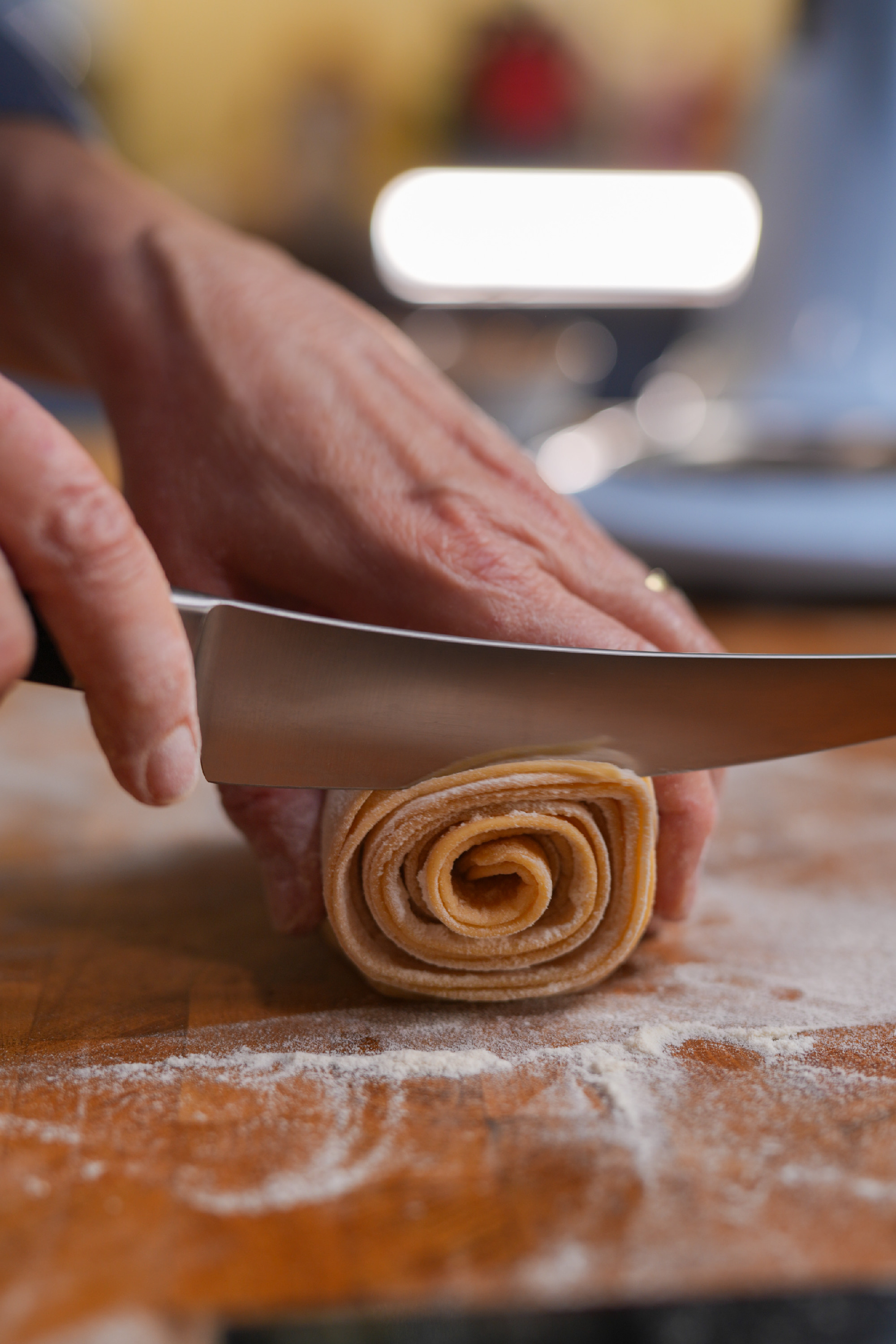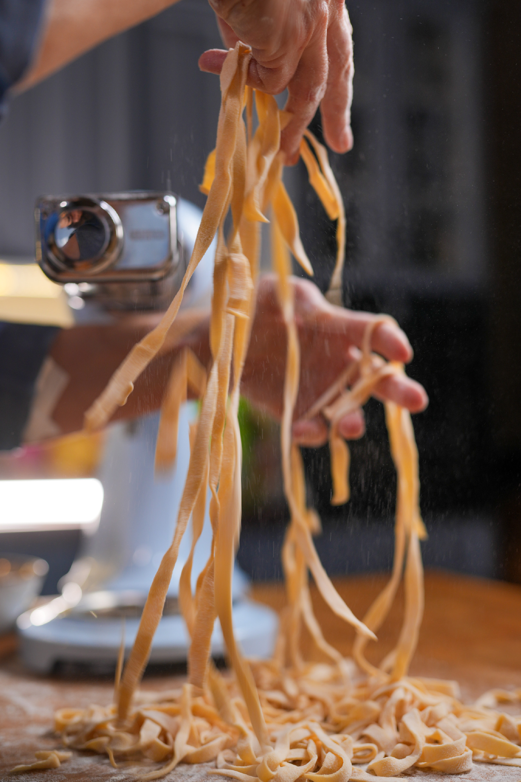 Elsőként begyúrjuk a tésztát. A lisztet a sóval és a tojásokkal alaposan összedolgozzuk, majd addig gyúrjuk, amíg szép sima felületű, rugalmas tésztát kapunk. Ez időigényes, de ne spóroljunk vele – ettől lesz igazán jó a házi tészta! Természetesen ezt a műveletet géppel is végezhetjük, akkor elég a végén átgyúrni egy kicsit kézzel. Ha elkészült, zacskóba tesszük, és legalább 30 percig pihentetjük.
