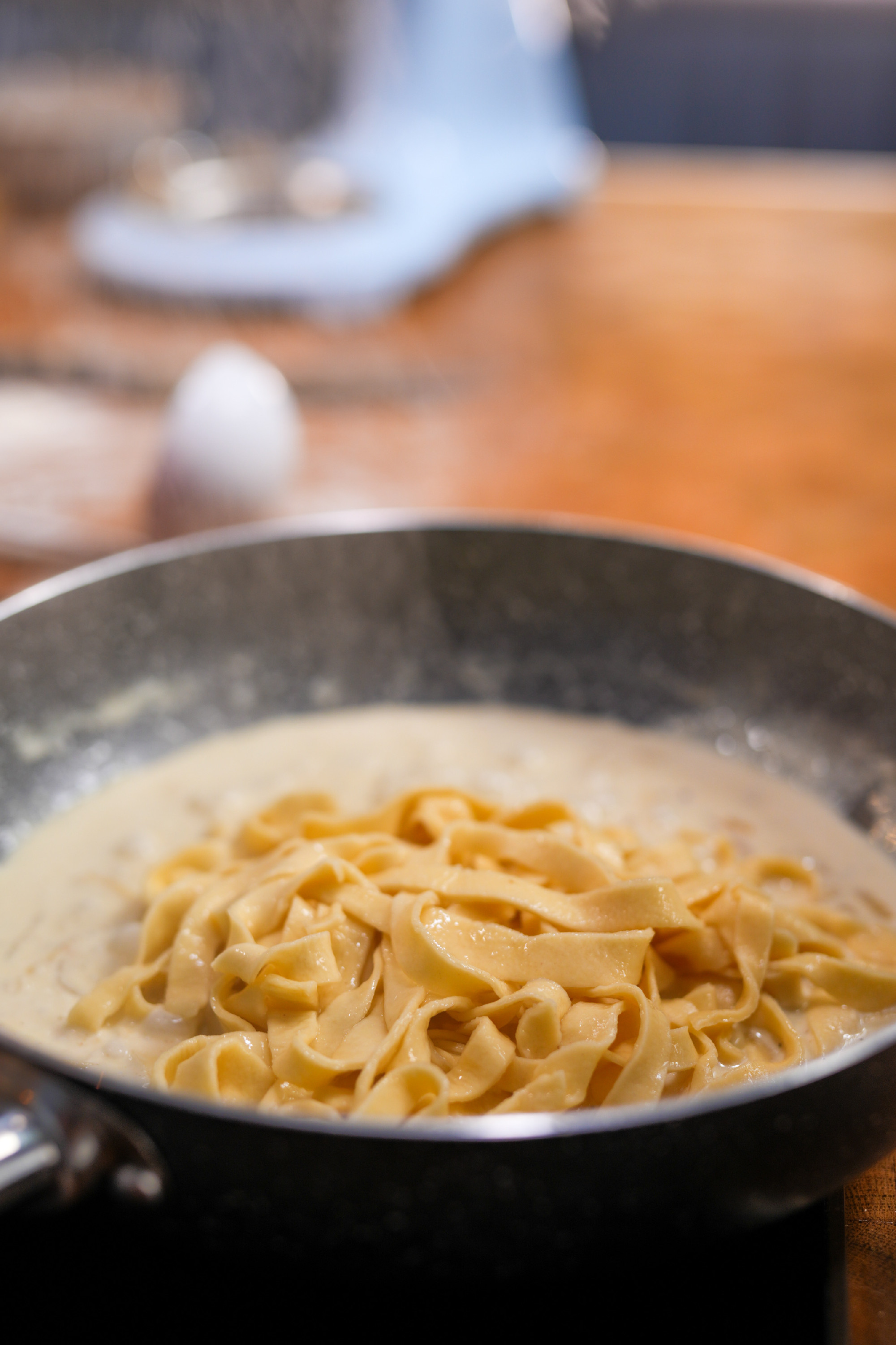 Közben sós vízben kifőzzük a tésztát körülbelül két perc alatt, majd közvetlenül a szószba szedjük ki, és alaposan összeforgatjuk.