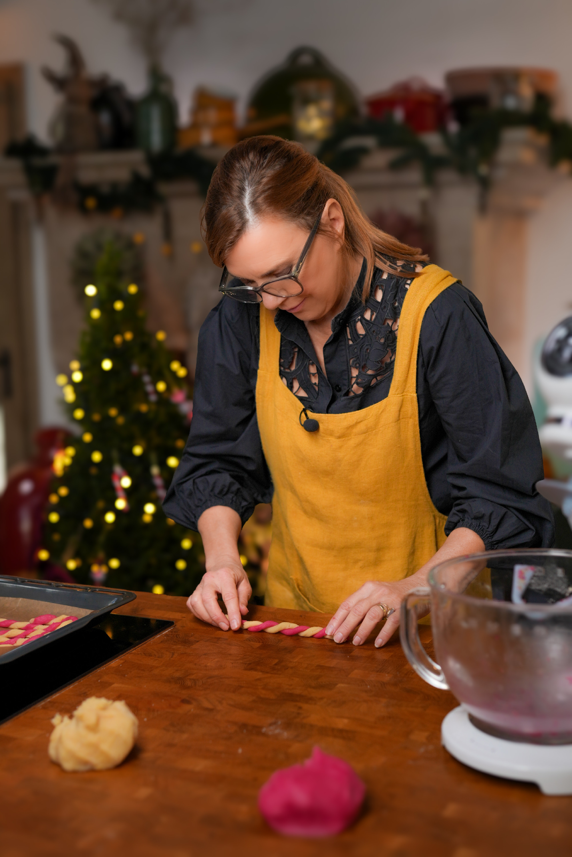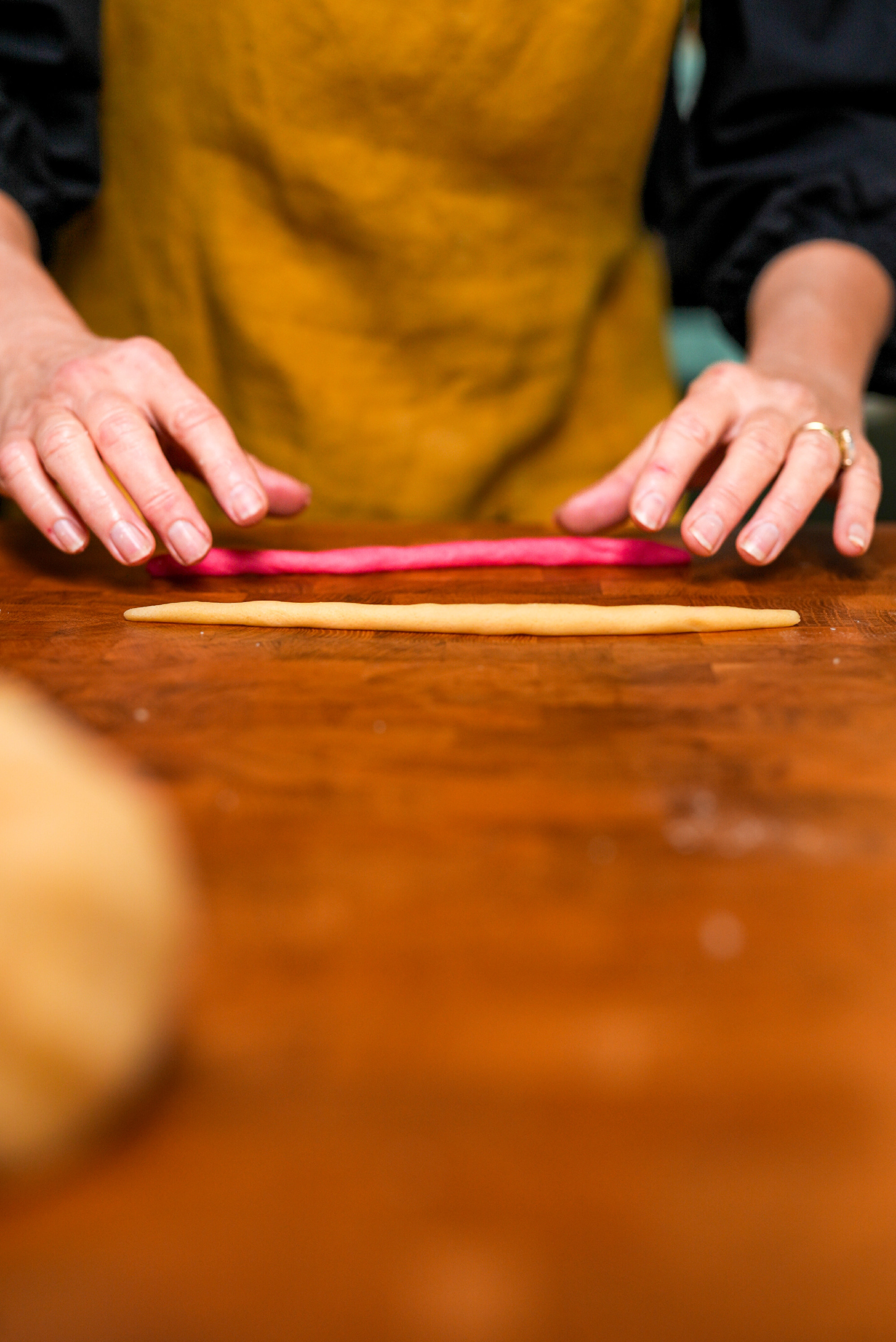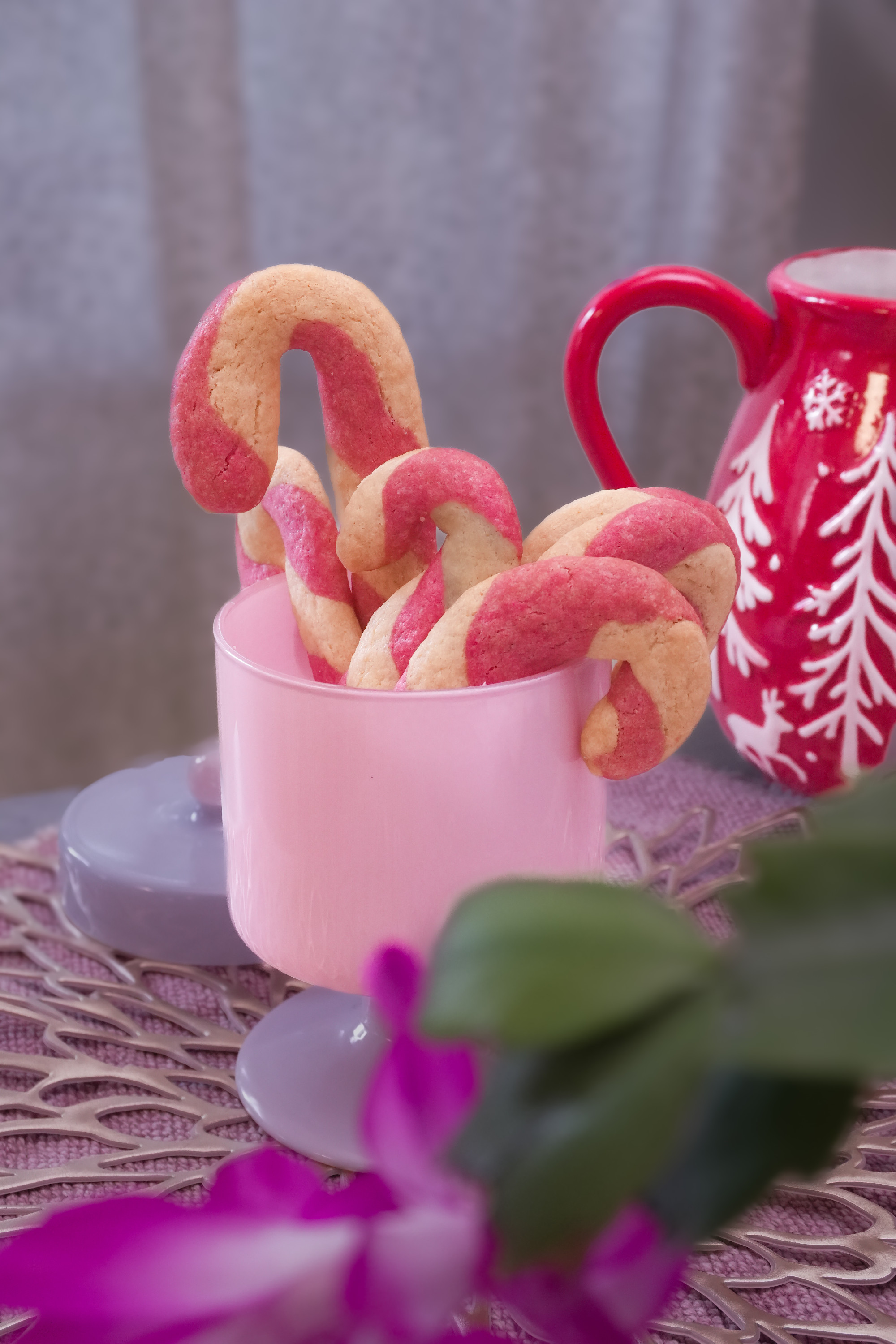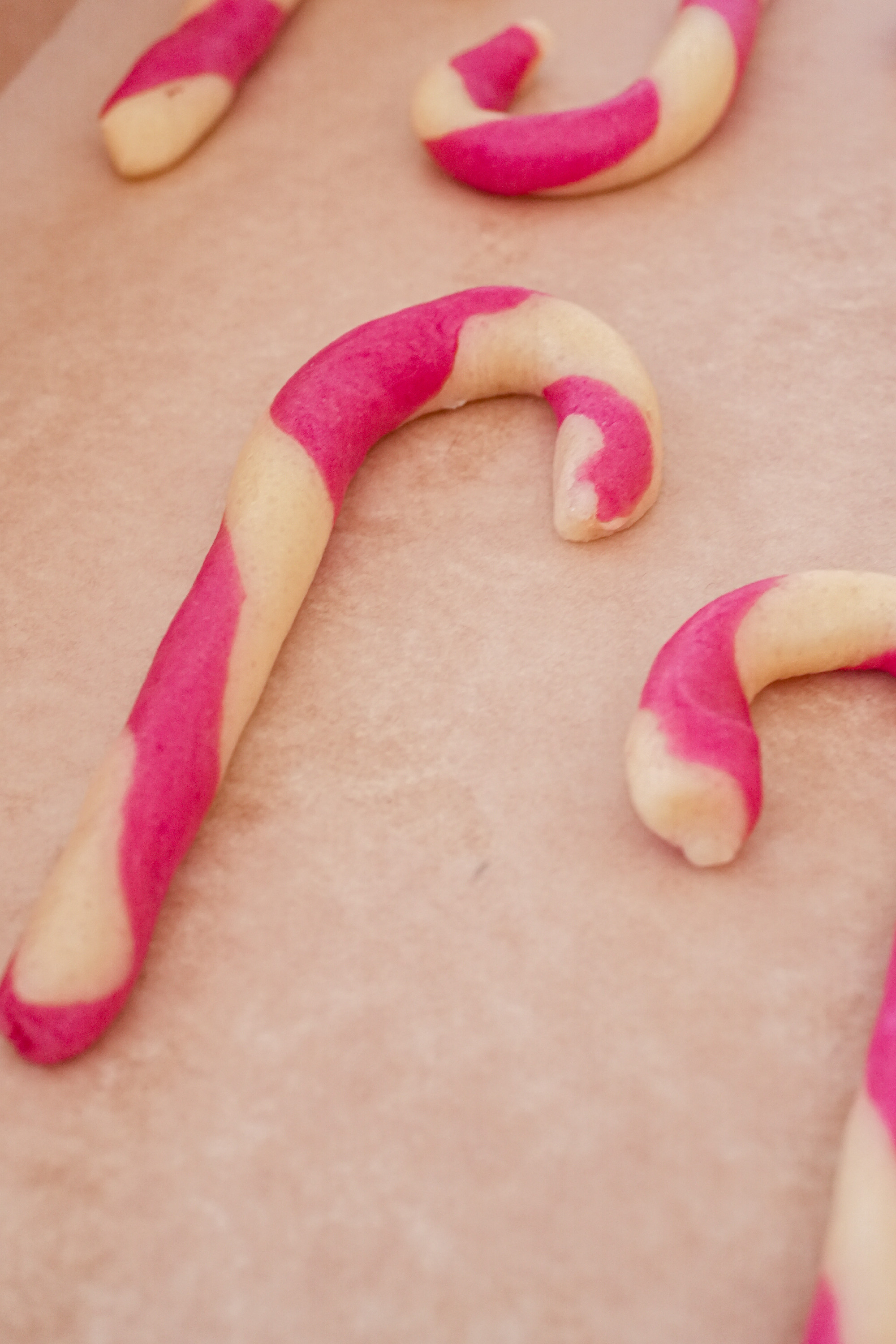 A formázáshoz a világos tésztából lecsípünk egy diónál kisebb darabot, és kb. 12–13 cm hosszú rudacskává sodorjuk. Ugyanezt megtesszük a piros tésztával is. A két rudat egymás mellé fektetjük, finoman összecsavarjuk, az egészet megsodorjuk, majd a tetejét ívben meghajlítjuk, hogy cukorpálca formát kapjunk. A kész kekszet sütőpapírral bélelt tepsire tesszük, és 4–5 cm távolságot hagyunk közöttük, mert sütés közben kissé terülnek. Így járunk el, amíg az összes tészta el nem fogy.