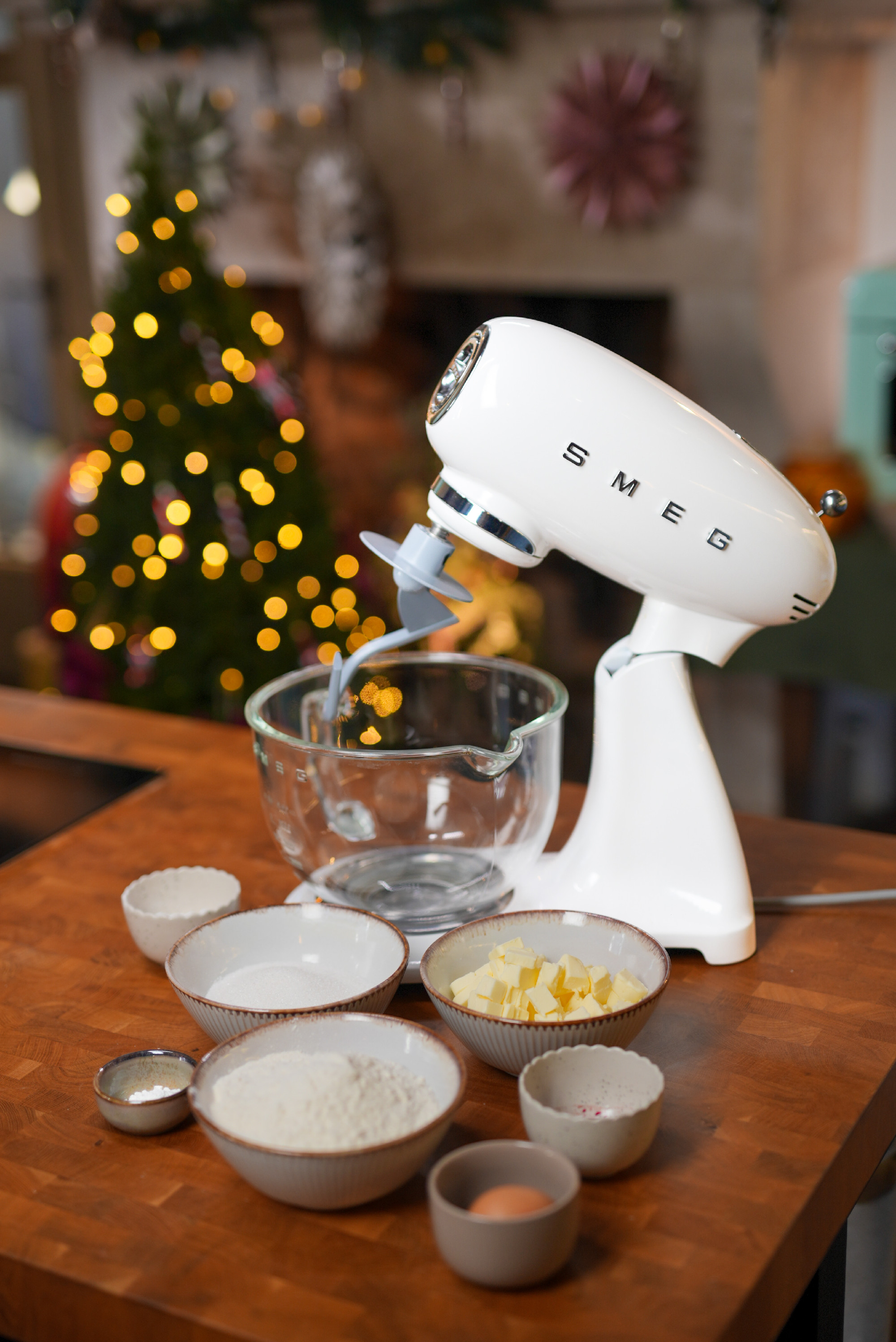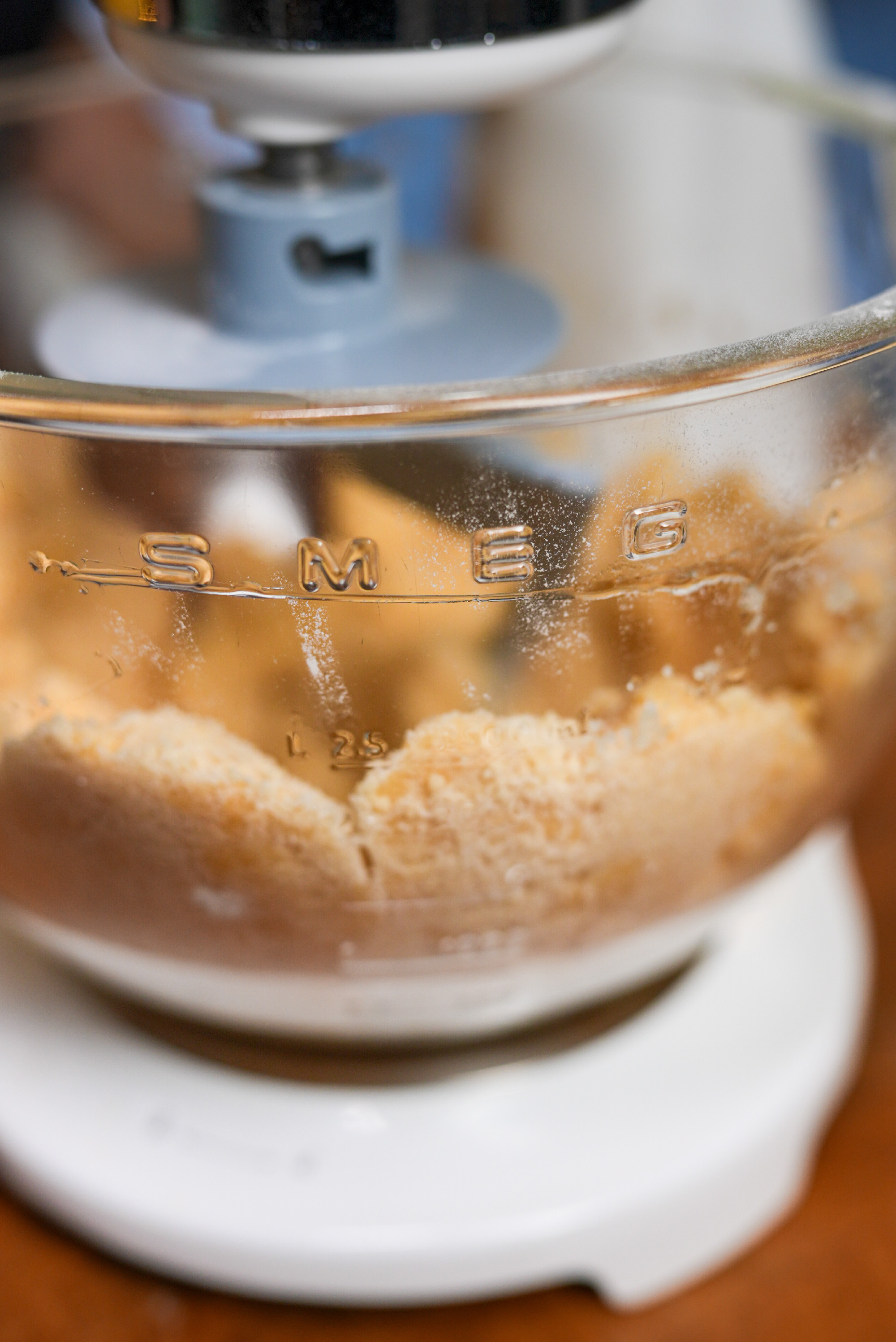 A hideg, felkockázott vajat a liszttel keverőtálba tesszük, hozzáadjuk a sütőport és a sót, majd robotgéppel összedolgozzuk. Ezután jöhet hozzá a cukor, majd a tojás.