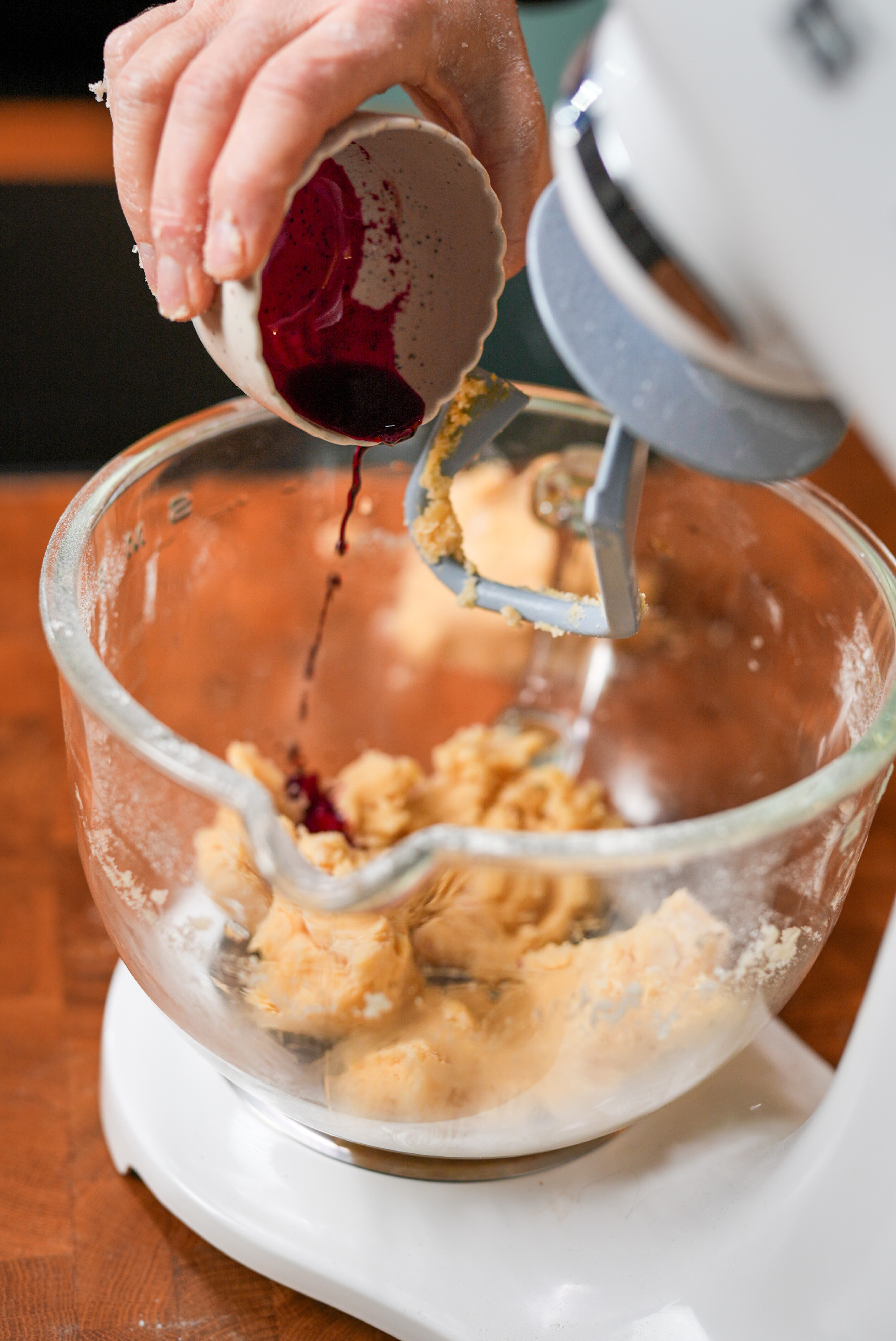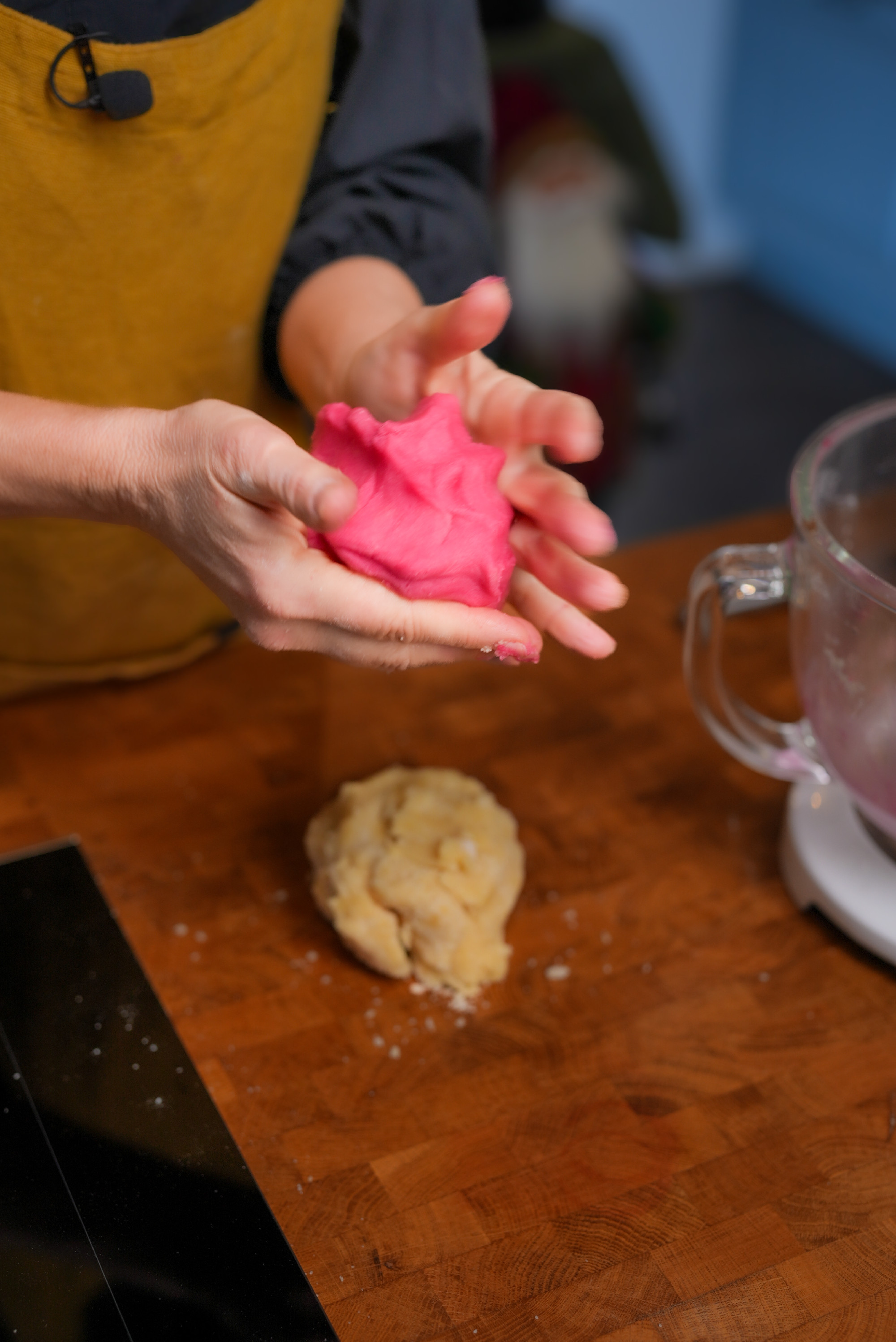 Ha szépen összeállt a tészta, két egyenlő részre osztjuk. Az egyik felét félretesszük, ez marad a világos rész. A másik felébe belecsöpögtetjük a piros ételfestéket, majd addig keverjük, míg egyenletes, szép piros színt kapunk. Ha szükséges, még adunk hozzá néhány cseppet, hogy elérjük a kívánt árnyalatot.