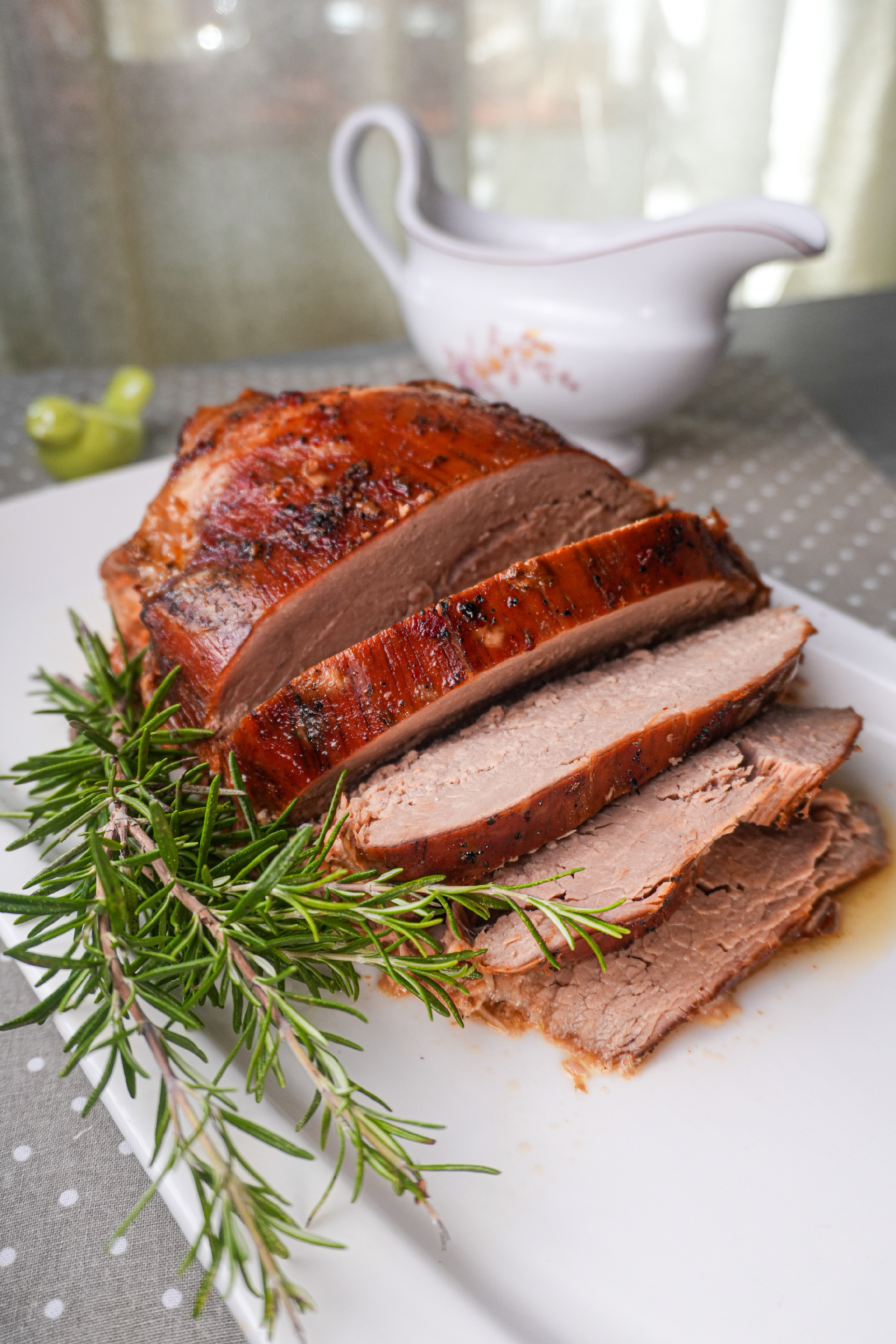 A sütőt 150 °C-ra előmelegítjük. A húst papírtörlővel szárazra töröljük, majd alaposan besózzuk. Forró serpenyőben kevés olívaolajon kérget sütünk a hús minden oldalára. Ezután frissen őrölt borssal és egy csipetnyi fűszerpaprikával megszórjuk.