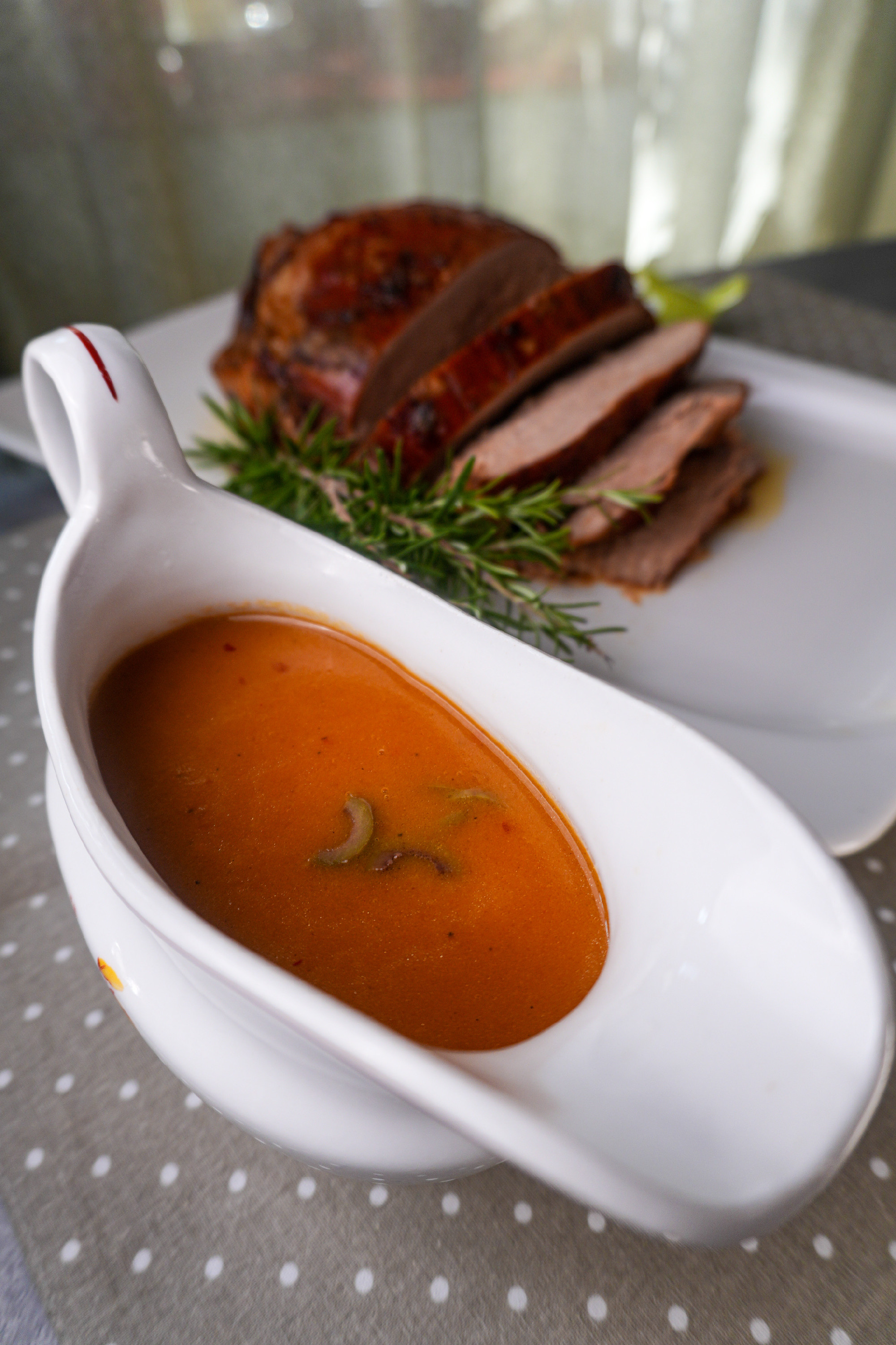 Ha elkészült a hús, kivesszük a sütőből, és pihenni hagyjuk. A vaslábasban maradt sült zöldségeket és szaftot turmixgépbe tesszük, majd simára turmixoljuk. Ez lesz a mártás alapja. A turmixolt mártást lábasba öntjük, majd felforraljuk. Közben hozzáadjuk a tejszínt, és ha szép krémes a szaft, akkor lehúzzuk a tűzről. Keverünk hozzá hideg, kockázott vajat, majd máris tálaljuk a felszeletelt hússal.