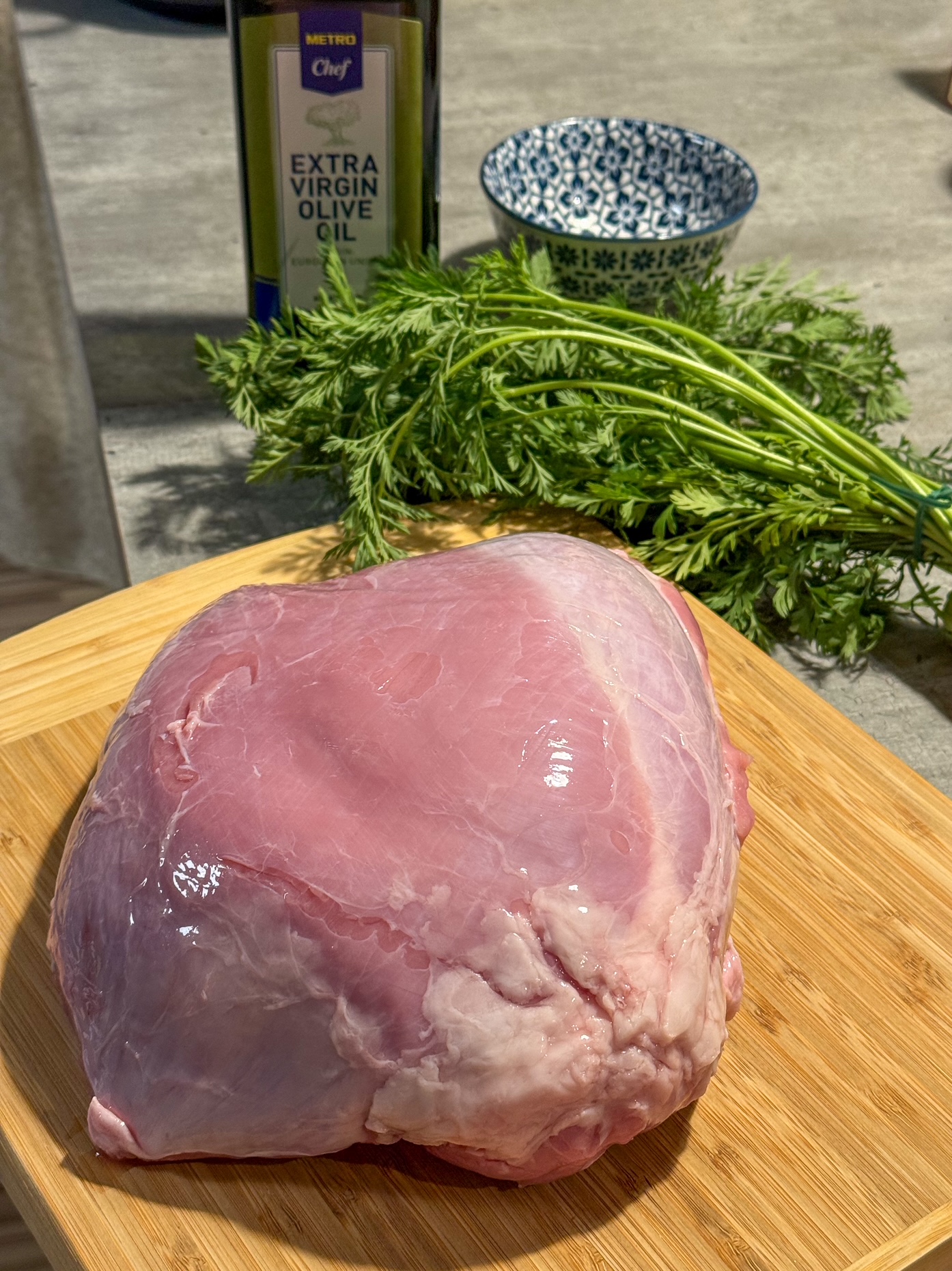 Egy vaslábasba kevés olívaolajat öntünk, erre jön a nagyobb darabokra vágott a vöröshagyma és a sárgarépa, illetve a fokhagymagerezdek. A zöldséges ágyra fektetjük a húst, majd öntünk alá kevés vizet vagy alaplevet. Teszünk mellé egy friss ág rozmaringot is. A lábast lefedjük, és a húst körülbelül 2-2,5 órán át sütjük lassú tűzön. Ekkor ellenőrizzük, és meglocsoljuk a saját szaftjával. Ha már puha, akkor fedő nélkül sütjük tovább, hogy egy kicsit még piruljon.