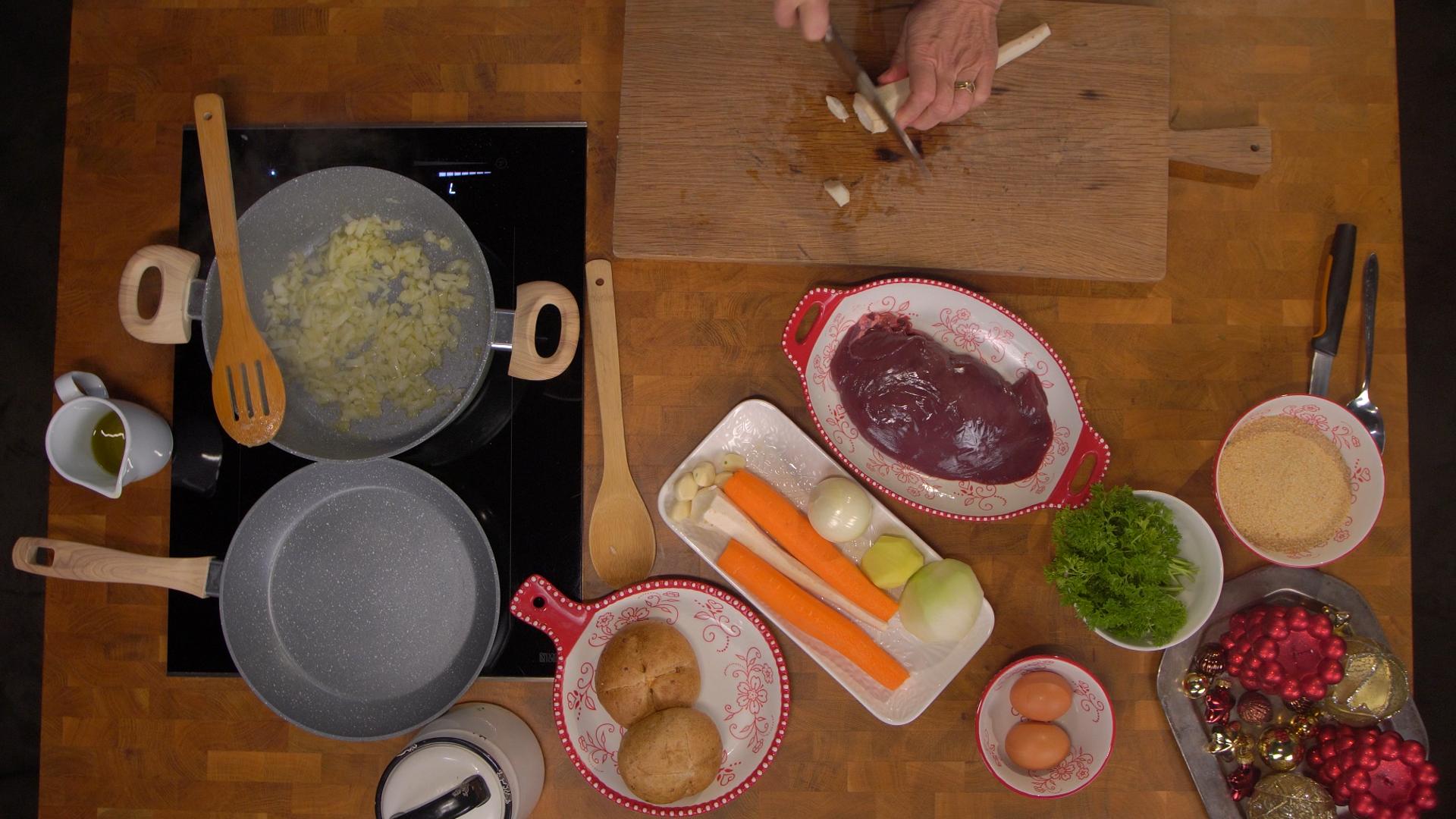 Először elkészítjük a zöldséglevest. Kevés olívaolajon megdinszteljük a kockára vágott hagymát, közben felvágjuk a zöldségeket. Amikor megdinsztelődött a hagyma hozzáadjuk a felvágott zöldségeket. Amíg a zöldségek megfőnek, felvágjuk a májhoz is a hagymát, és kevés olívaolajon elkezdjük megdinsztelni. Amikor a zöldségek alatt az olaj szép aranysárga, felöntjük vízzel és tovább főzzük.
