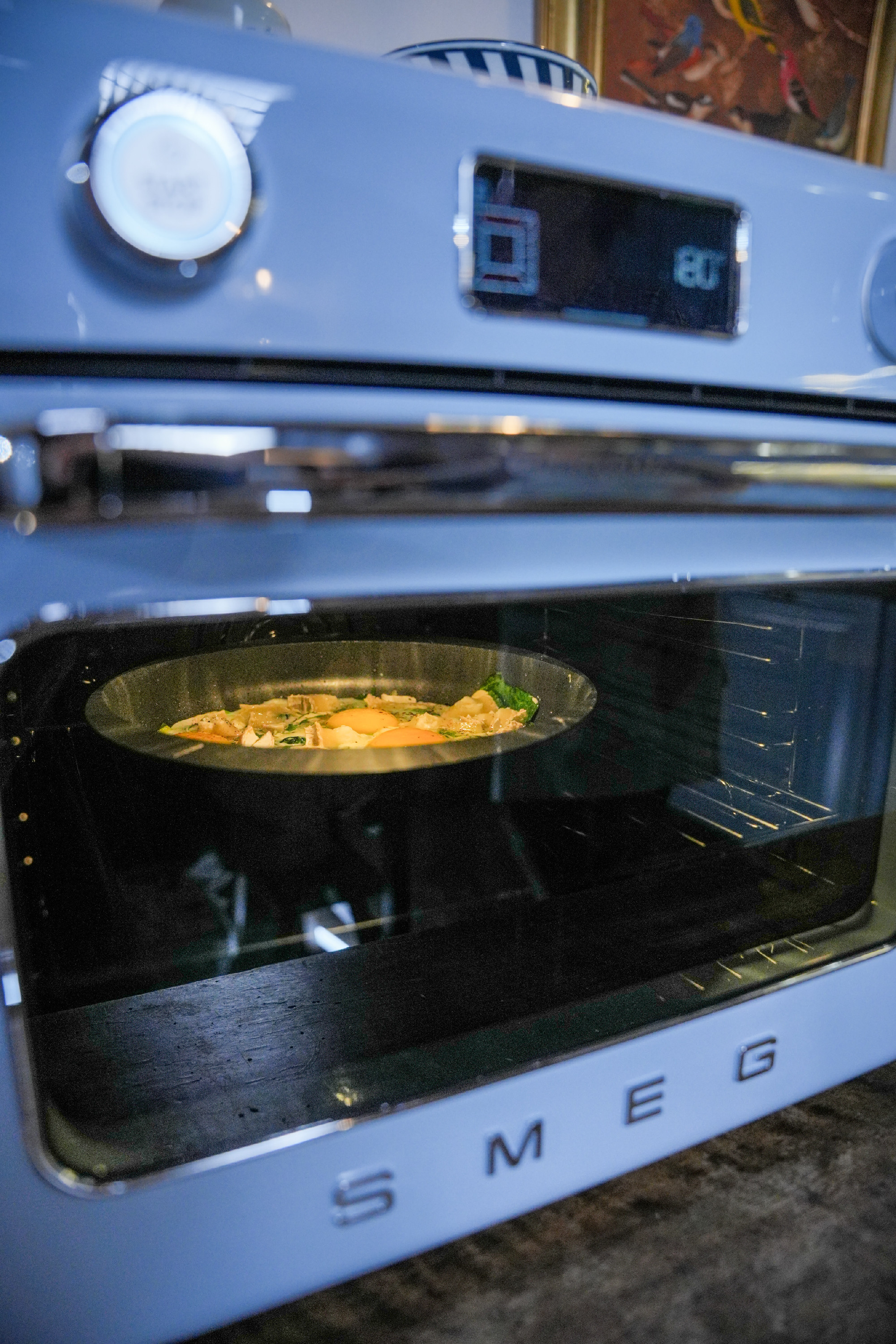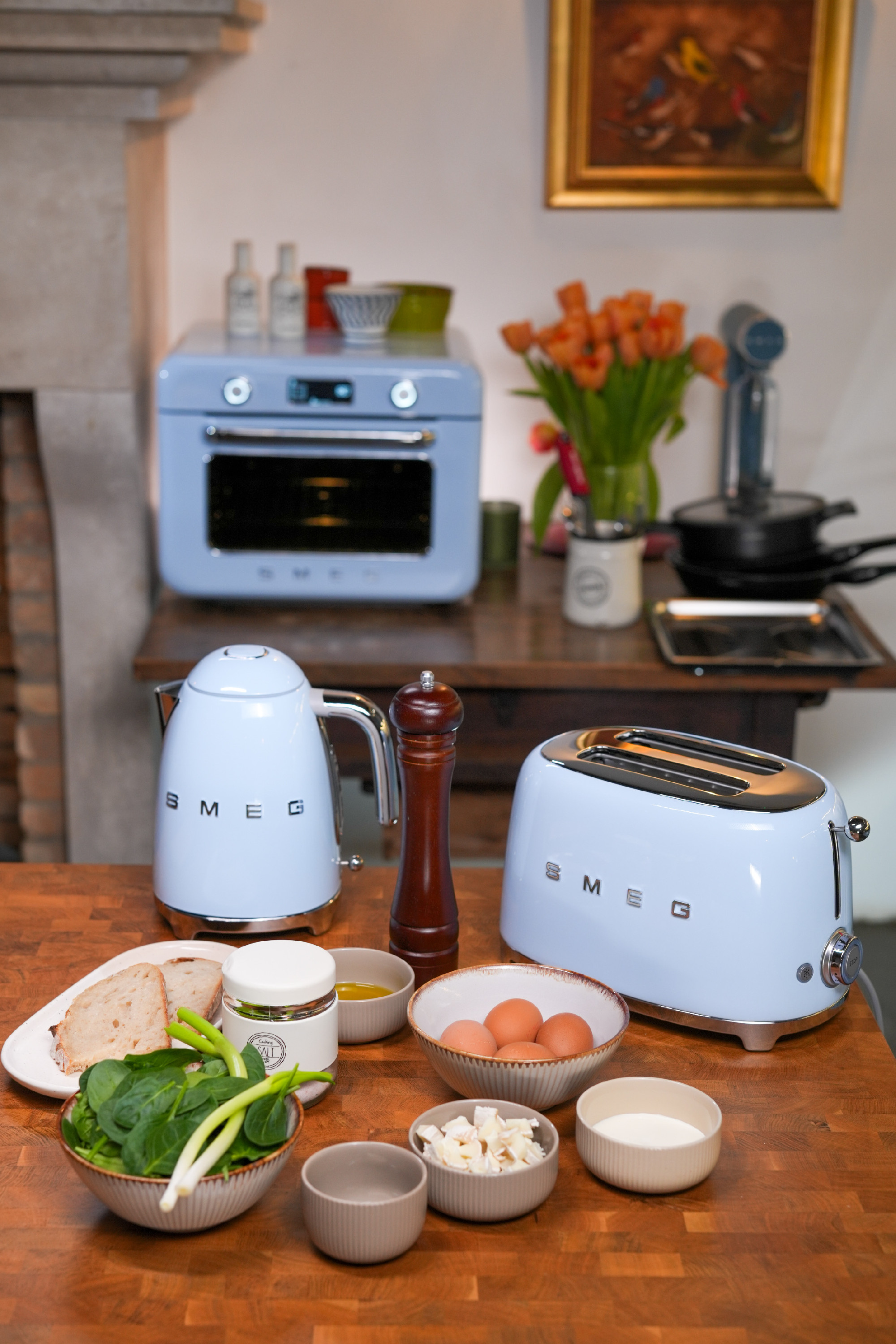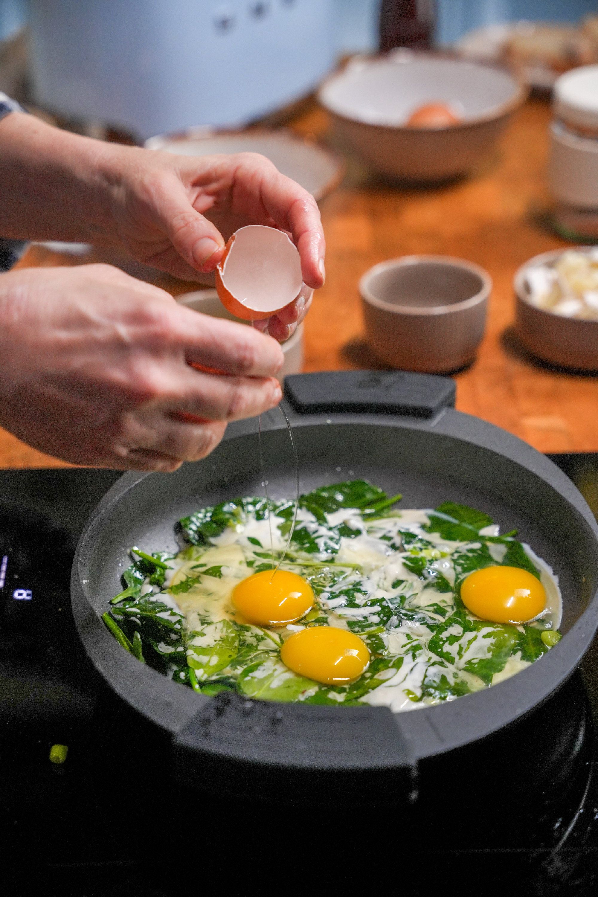 Egy sütőben is használható serpenyőben felhevítjük az olívaolajat, majd 1-2 percig dinszteljük rajta az újhagymát, majd rádobjuk az összevágott fokhagymát is. Beletesszük a spenótot, és addig pároljuk, amíg össze nem esik. Ekkor hozzáadjuk a tejszínt, és sóval, borssal ízesítjük. A spenótos alapba négy kis mélyedést készítünk, és mindegyikbe beleütünk egy tojást. Megszórjuk a falatnyi darabokra vágott kecskesajttal, majd a serpenyőt betesszük a 180 fokra előmelegített sütőbe.