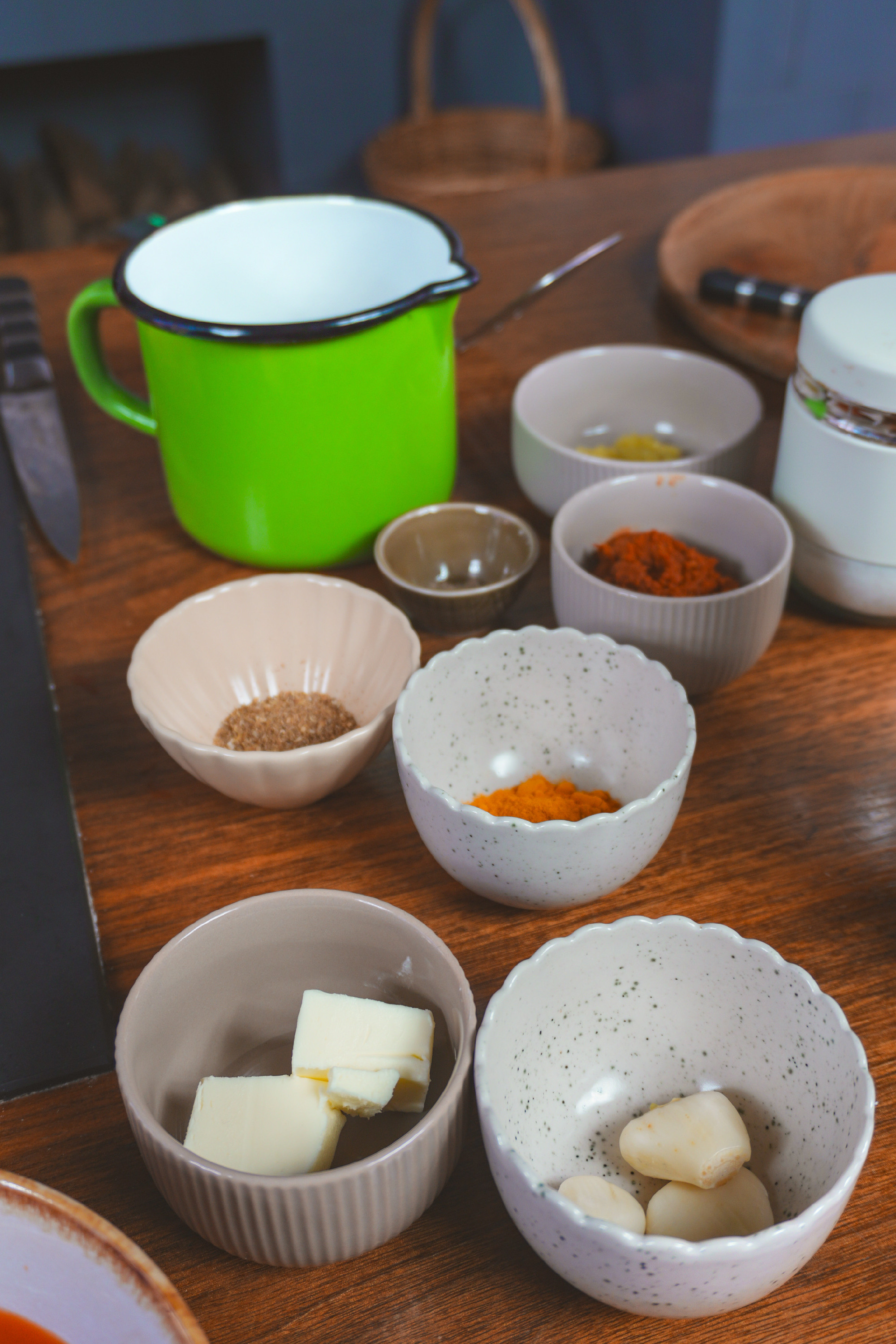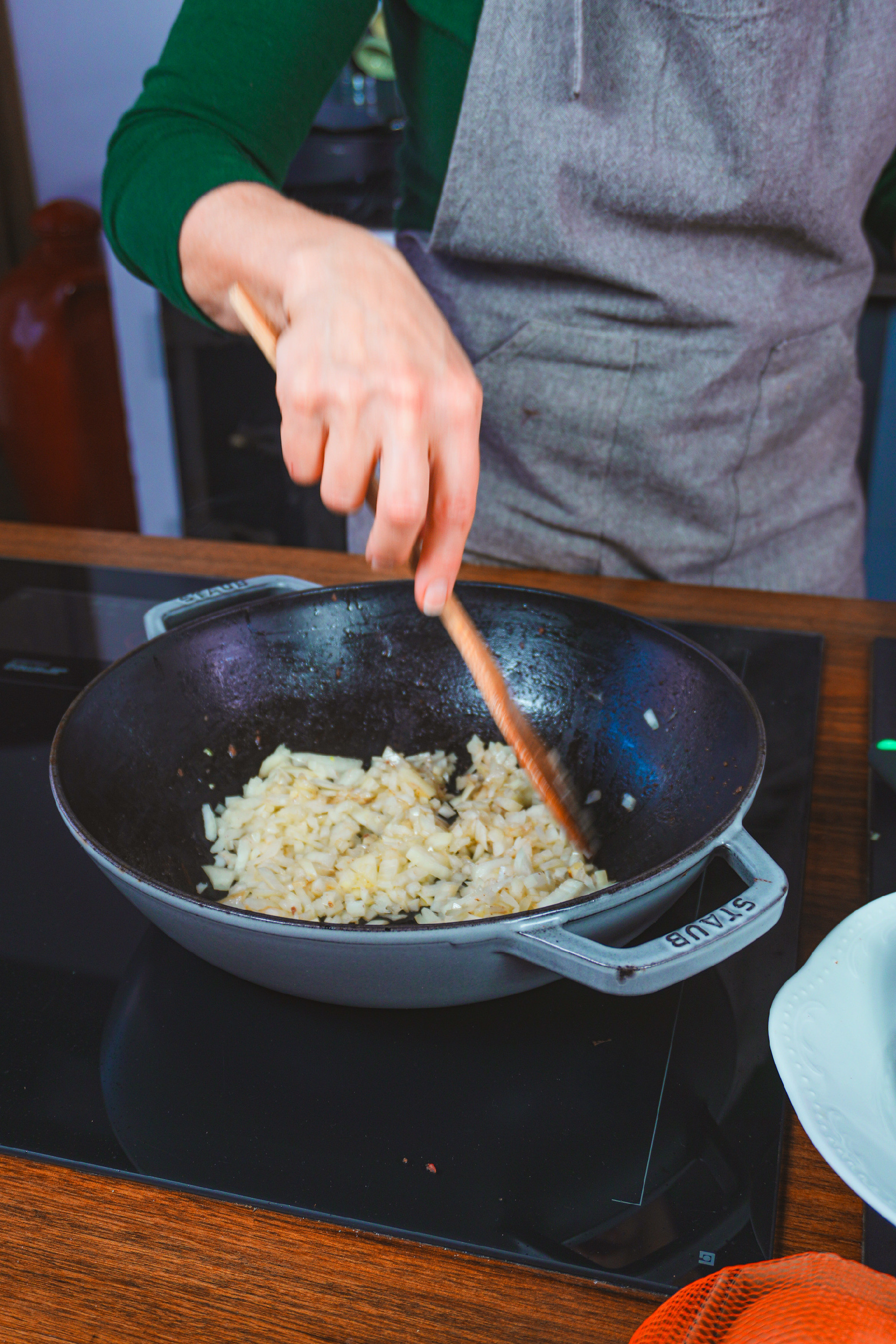 Ugyanebben az edényben felmelegítjük a vajat, majd hozzáadjuk a hagymát. Közepes lángon, türelmesen pirítjuk, amíg aranybarnára karamellizálódik. Beletesszük a fokhagymát, a gyömbért, a chilit, a kurkumát, az őrölt koriandert és a curry-pasztát, majd rövid ideig pirítjuk.