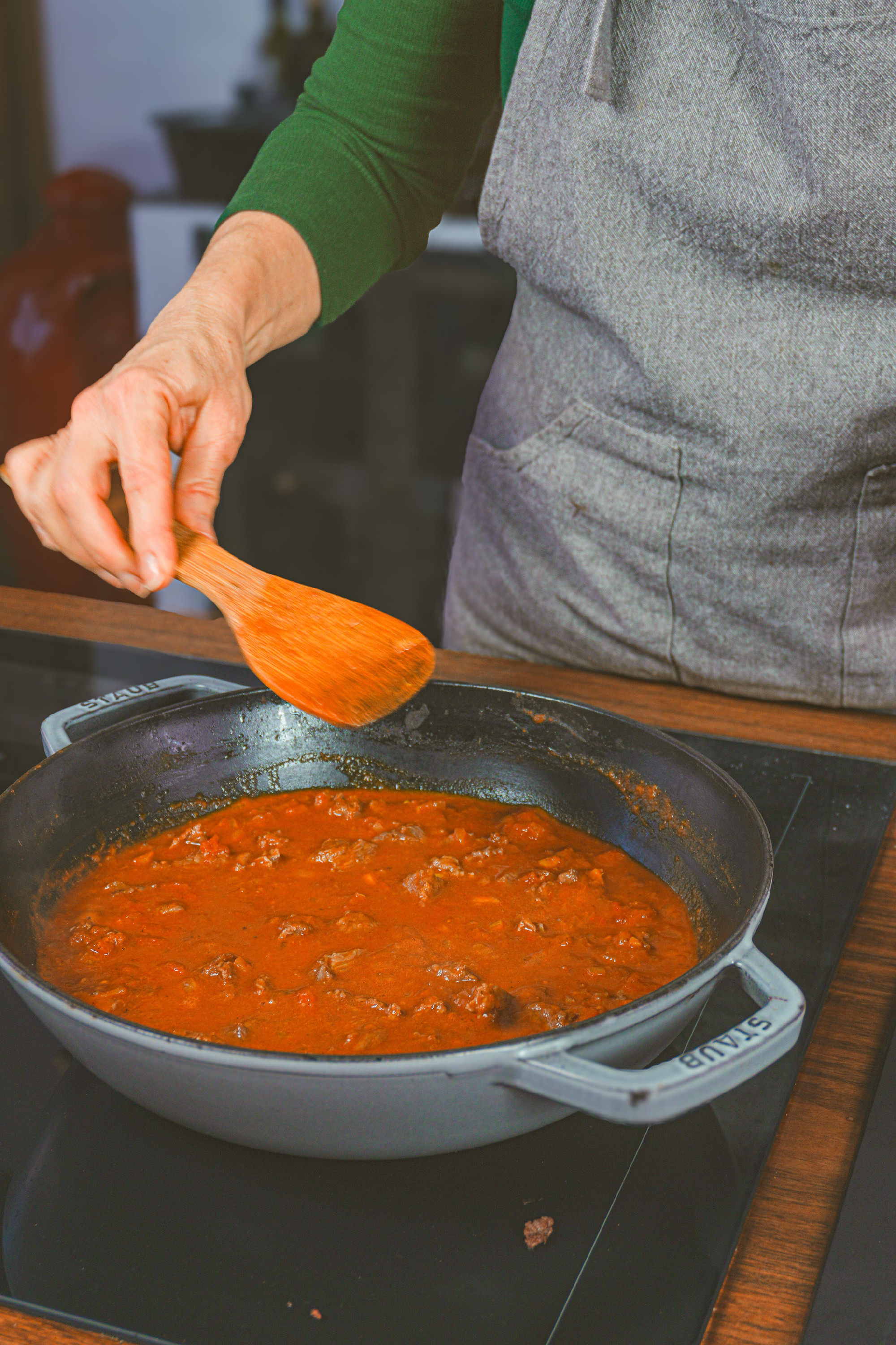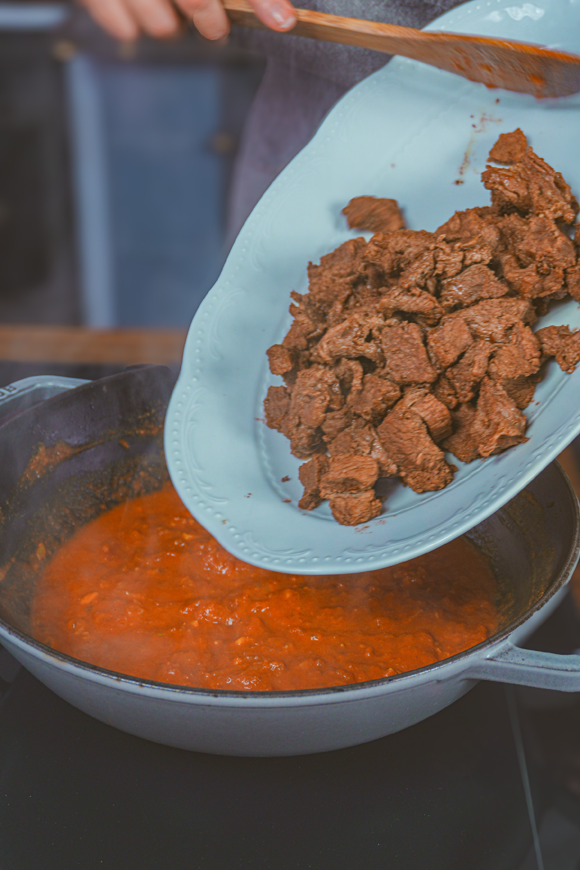 Hozzáadjuk a paradicsomot, felöntjük az alaplével, megszórjuk a cukorral, és összeforraljuk. Visszatesszük a mártásba a húst, lefedjük, és kis lángon 1,5–2 órán át főzzük, amíg a marha omlós nem lesz. Az utolsó 20 percre levesszük a fedőt, hogy szépen besűrűsödjön a szaft.