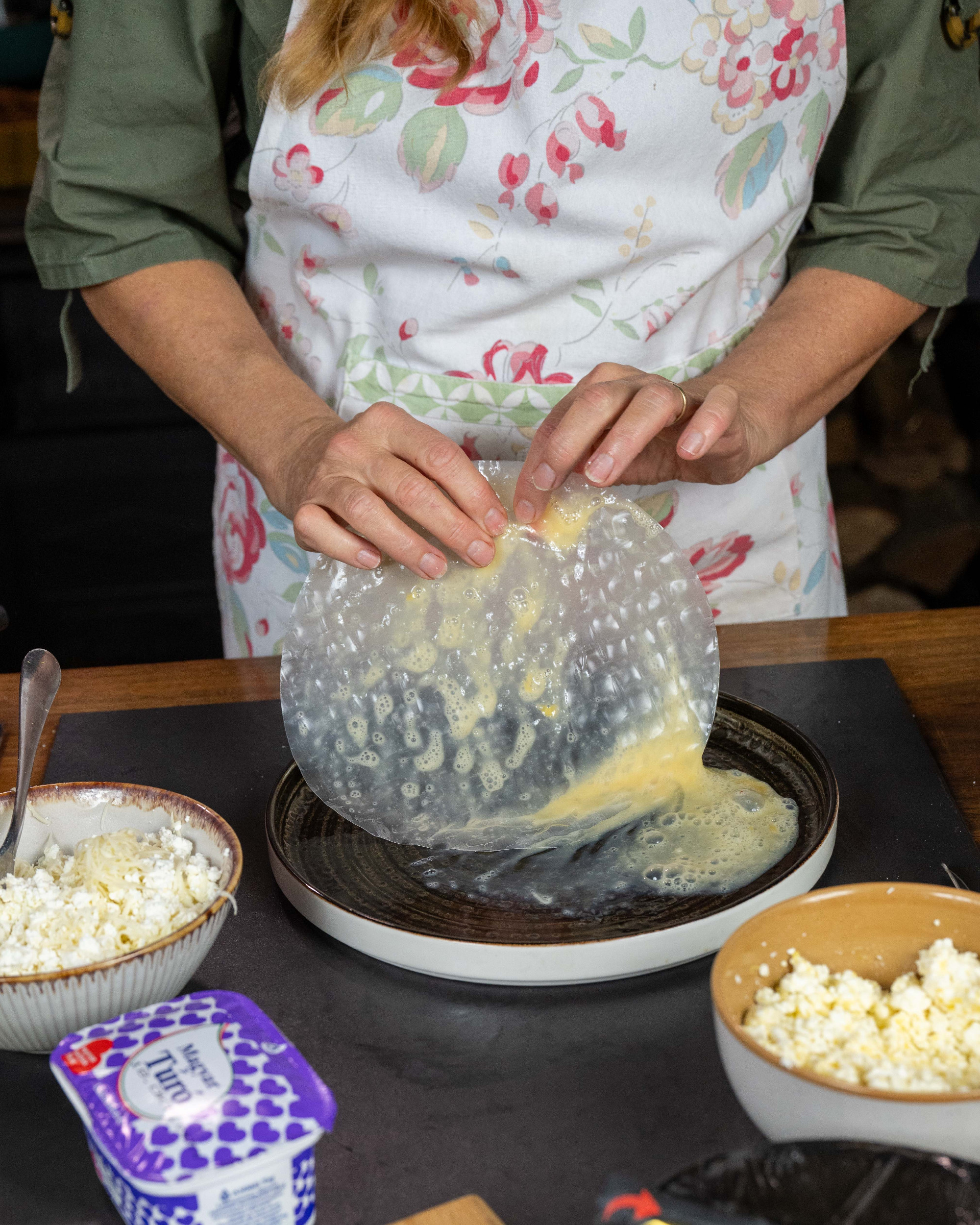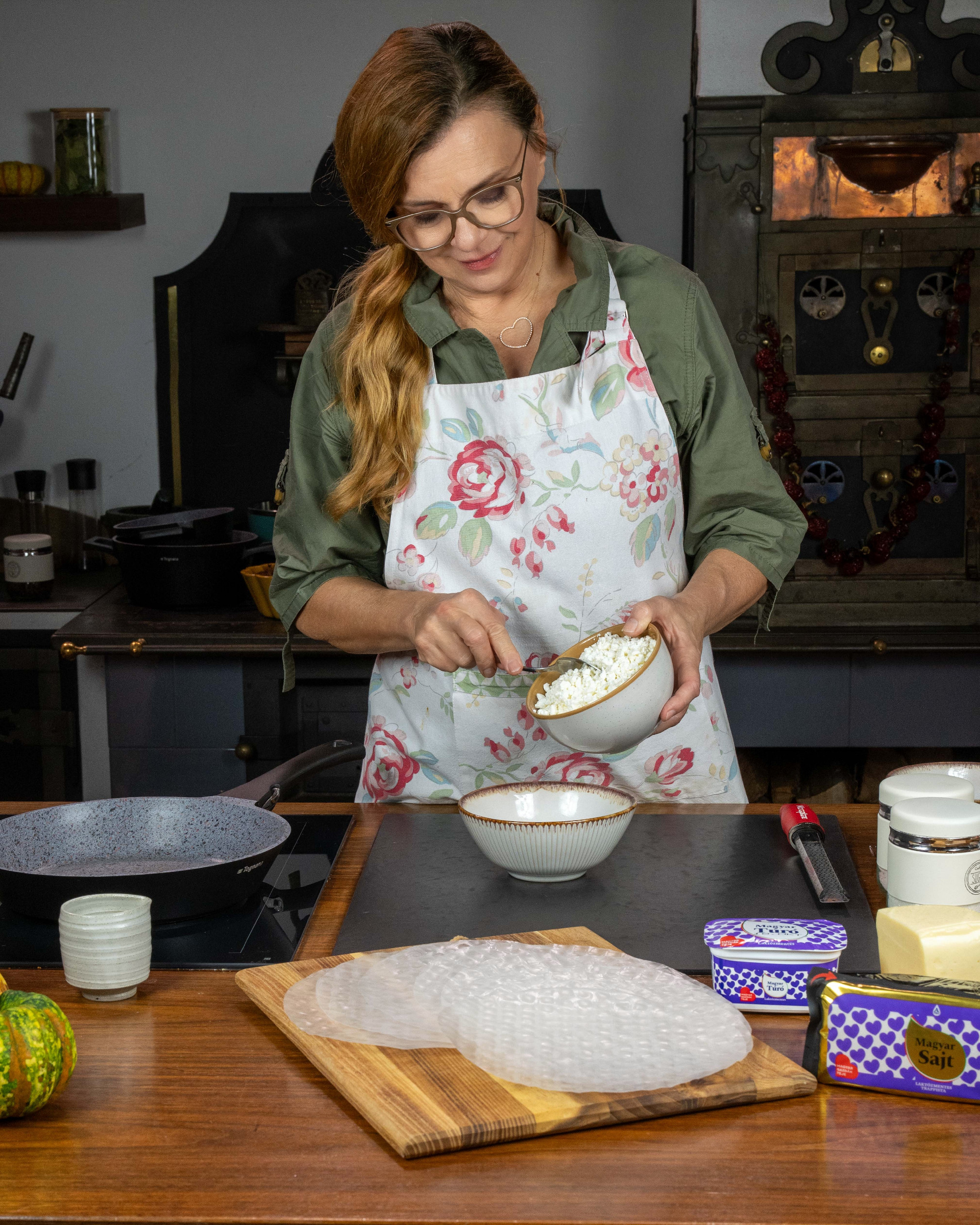 Az édes változathoz a túrót elkeverjük a cukorral és a citrom reszelt héjával. A tojásokat kézzel felverjük, majd belemártunk egy rizslapot úgy, hogy a felületét teljesen be tudja vonni a tojás. Ezután a lapot magunk elé terítjük, és a közepébe teszünk egy adagot a túrós töltelékből. Négy oldalról ráhajtjuk a lapot. Egy serpenyőt közepesen forróra felhevítünk, öntünk bele kevés olajat. A hajtással lefelé belehelyezzük a megtöltött rizslapot, és szép pirosra sütjük. Olyan lesz, mint egy finom túrós palacsinta.