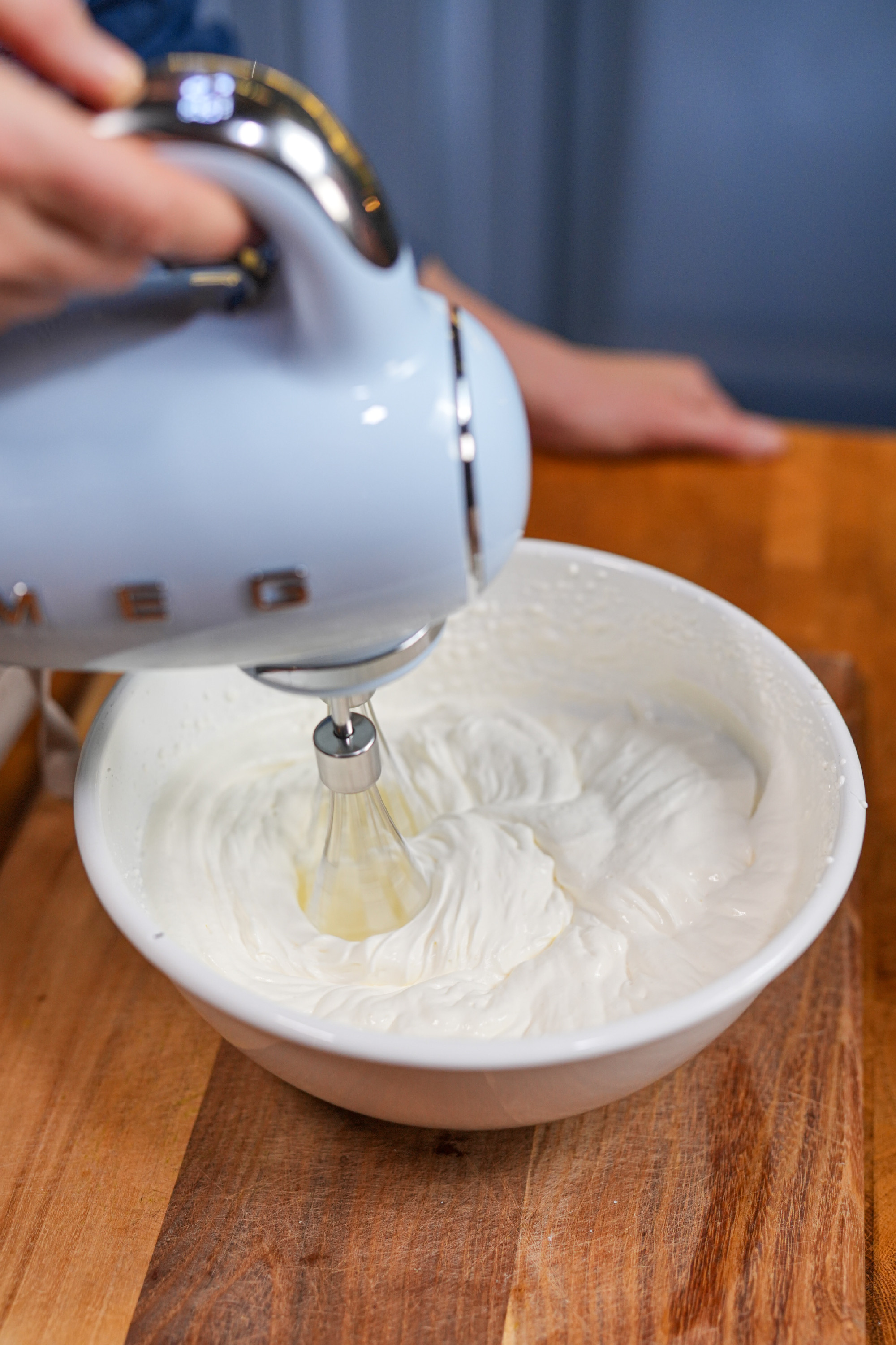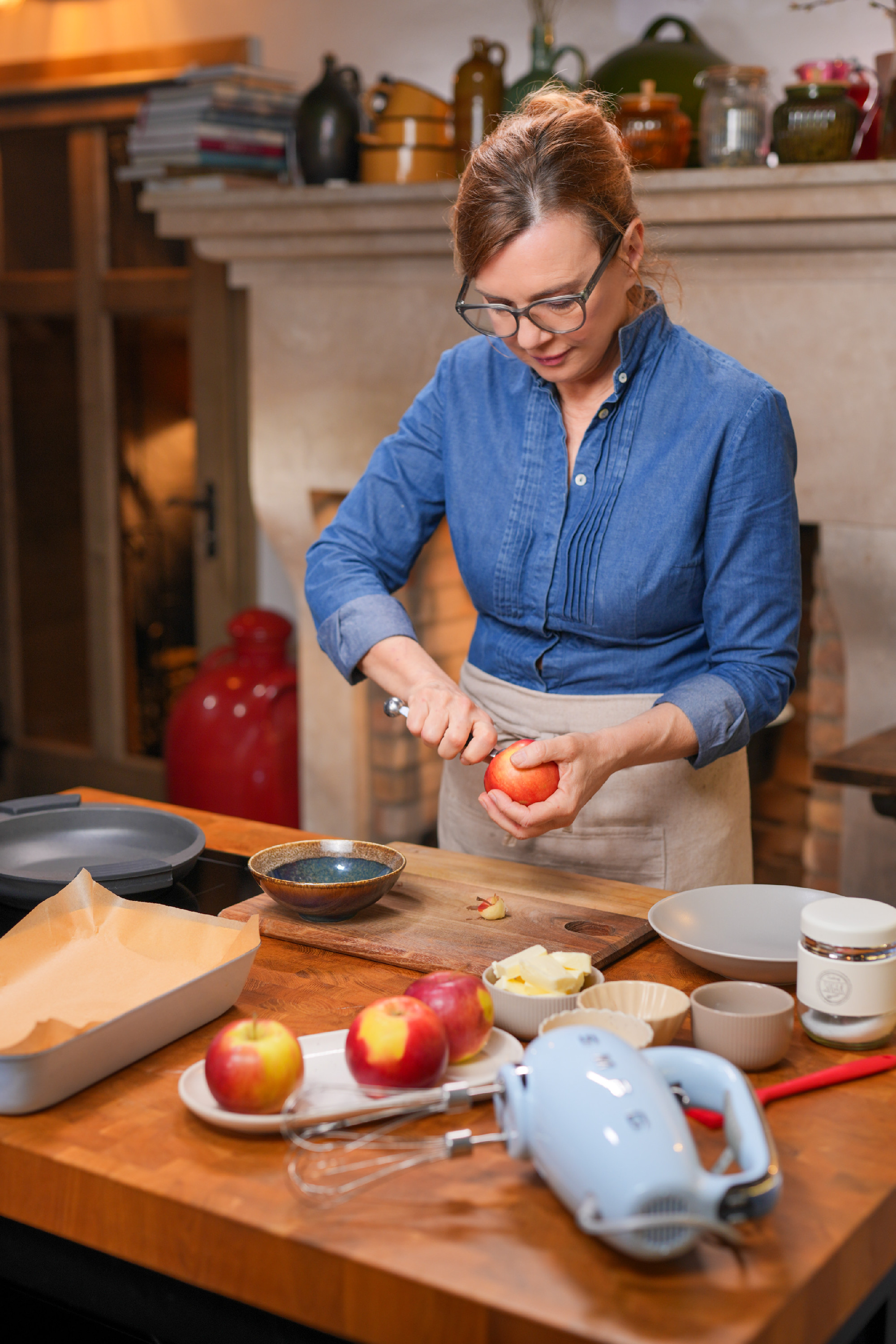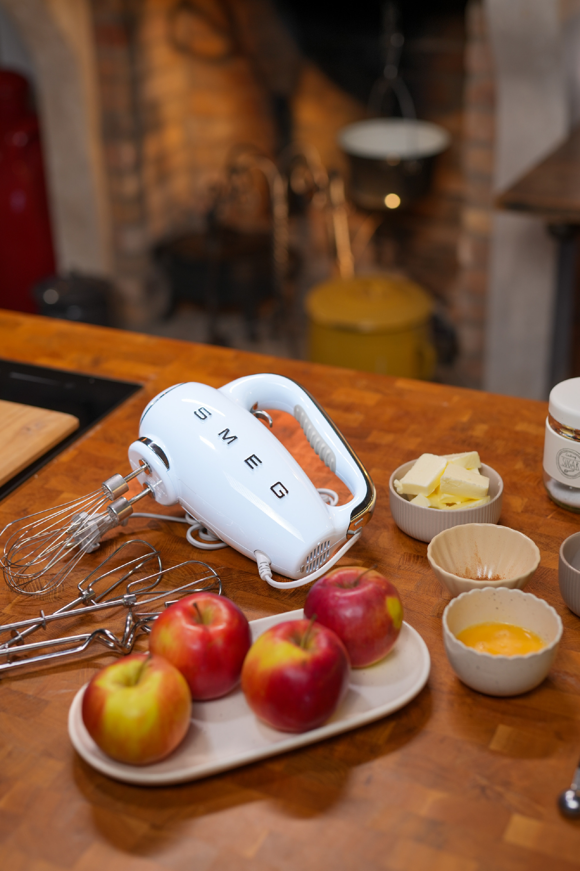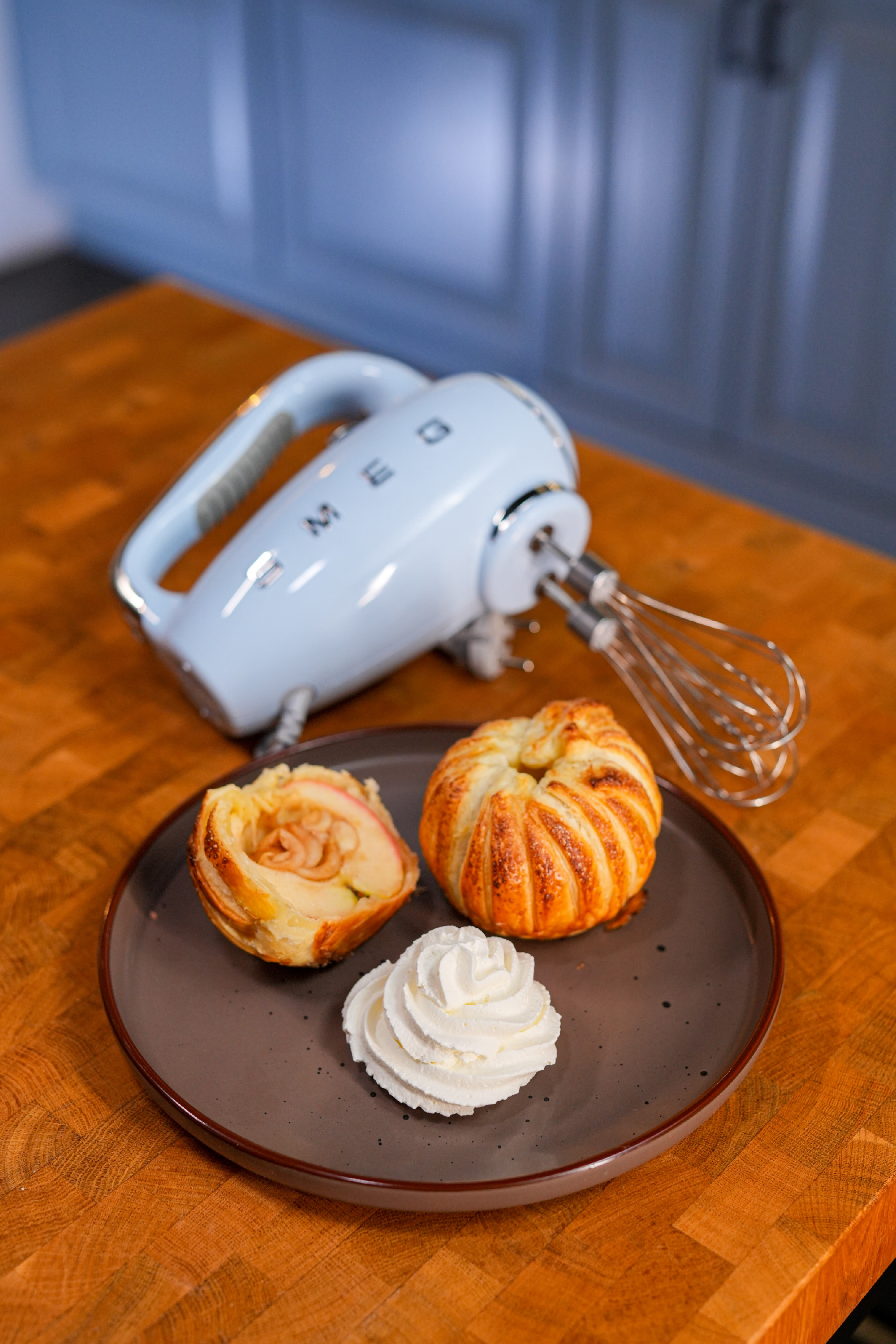Közben a tejszínt a porcukorral kemény habbá verjük. Az elkészült, még meleg almákat a tejszínhabbal tálaljuk.