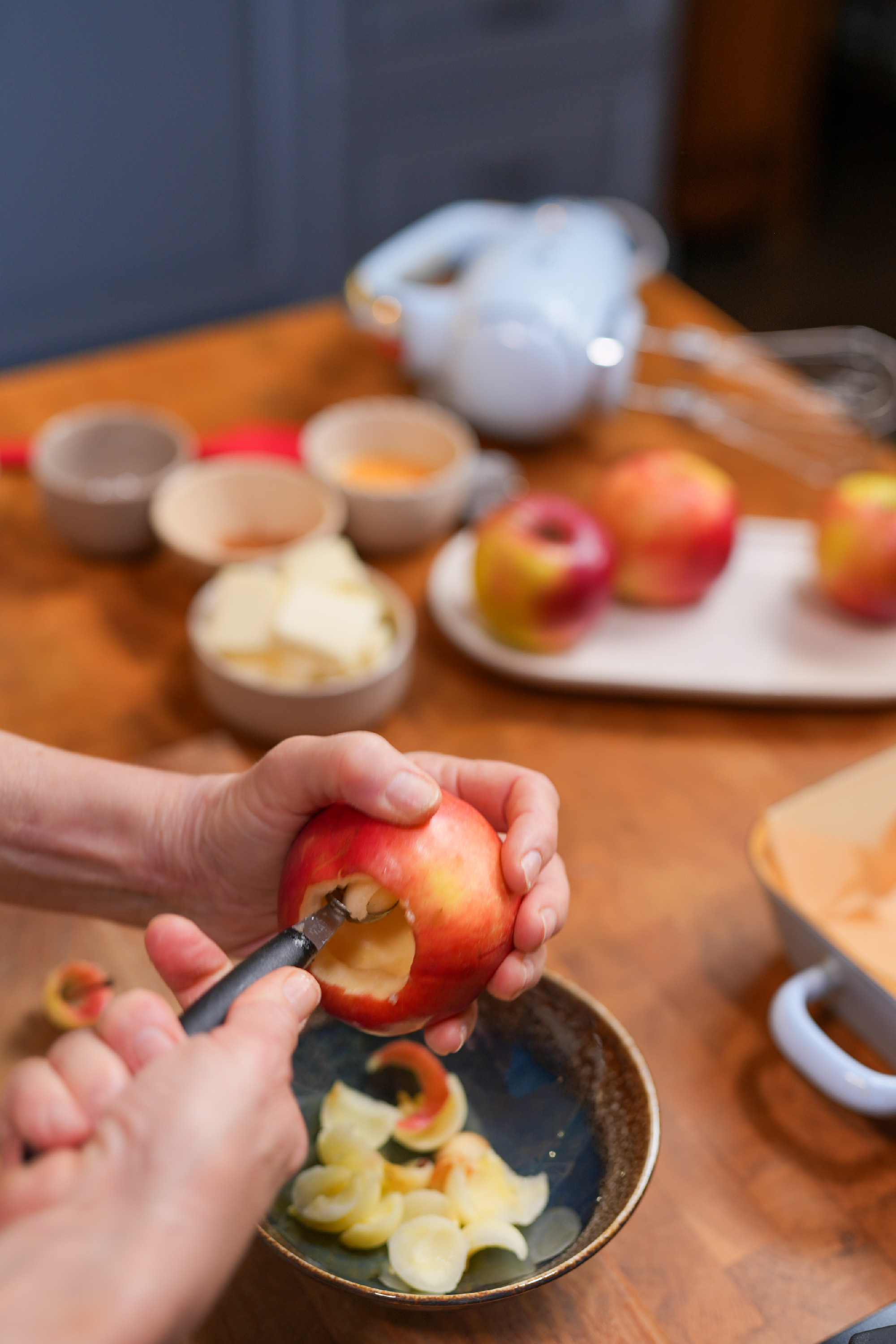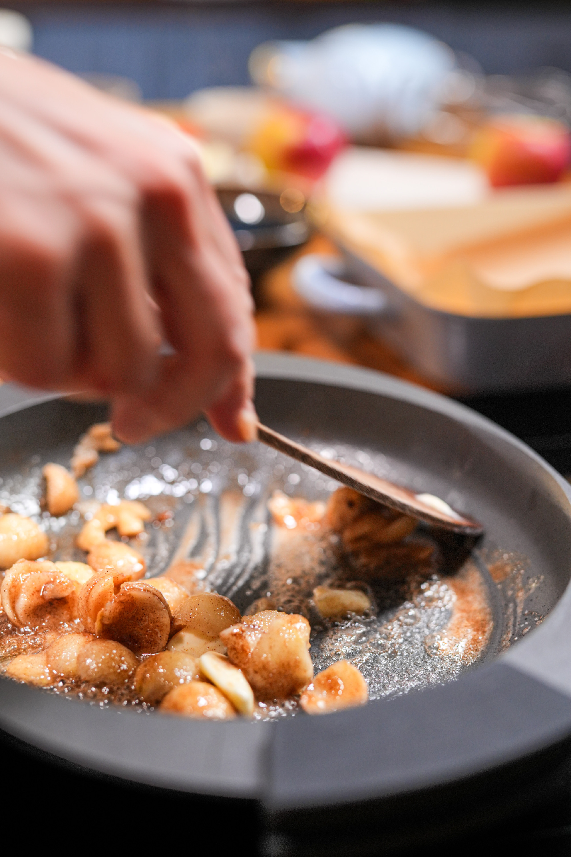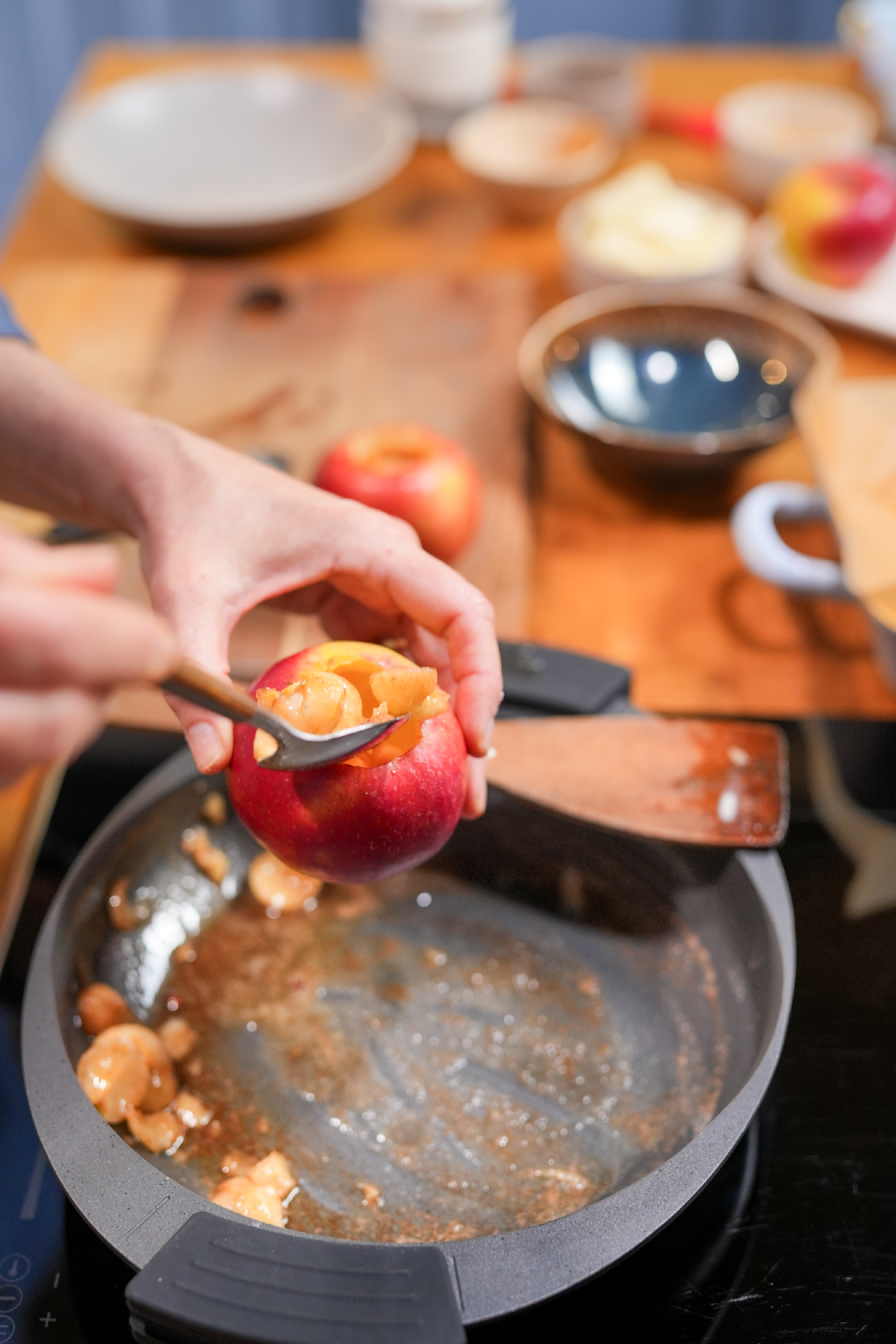 Az almákat megmossuk, majd a belsejüket óvatosan kivájjuk. Egy serpenyőben kevés vajon a cukorral és a fahéjjal pár perc alatt megpároljuk az alma darabokat. Ne főzzük túl, maradjon roppanós! Ezután visszakanalazzuk a tölteléket az almákba.