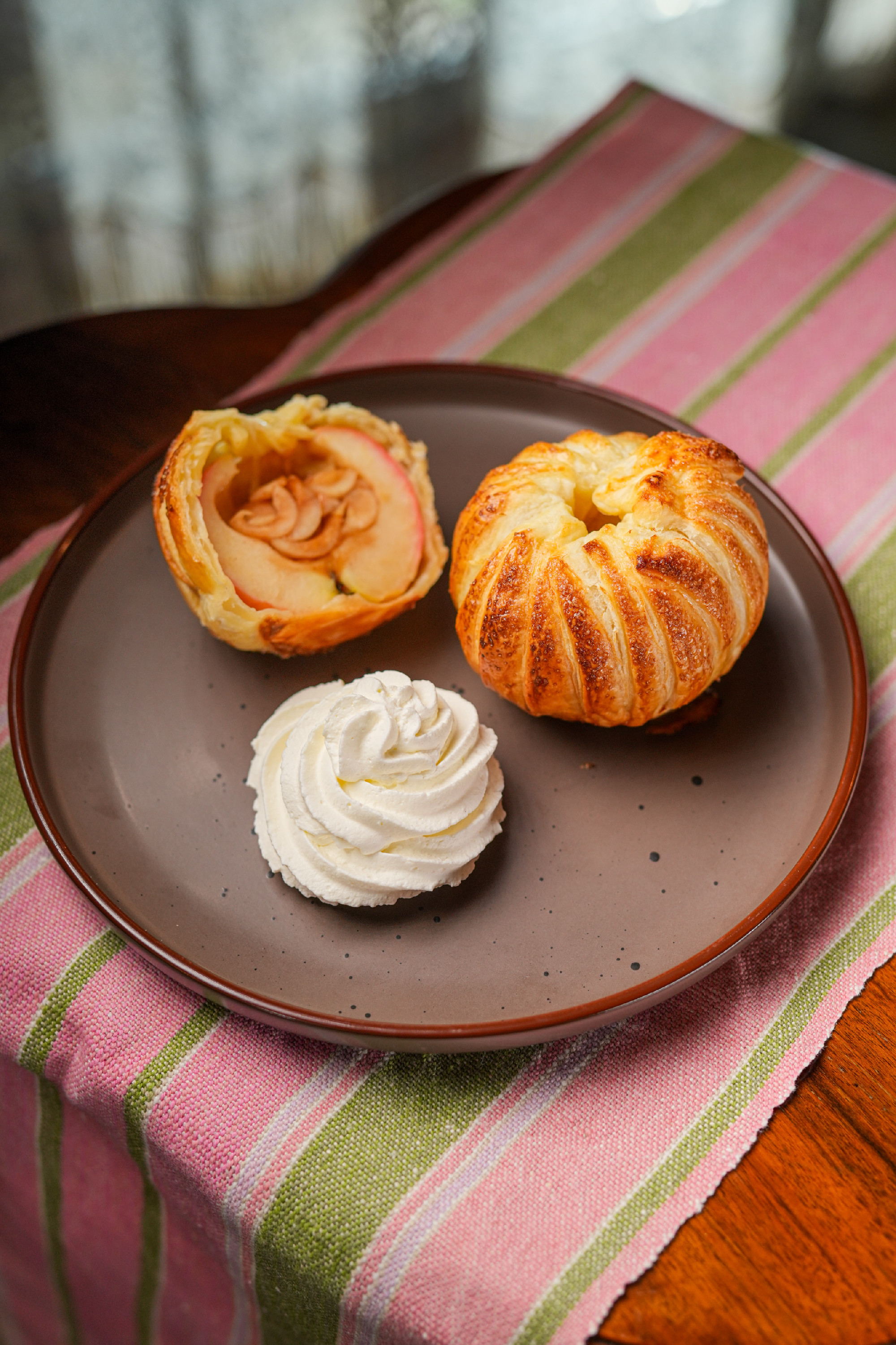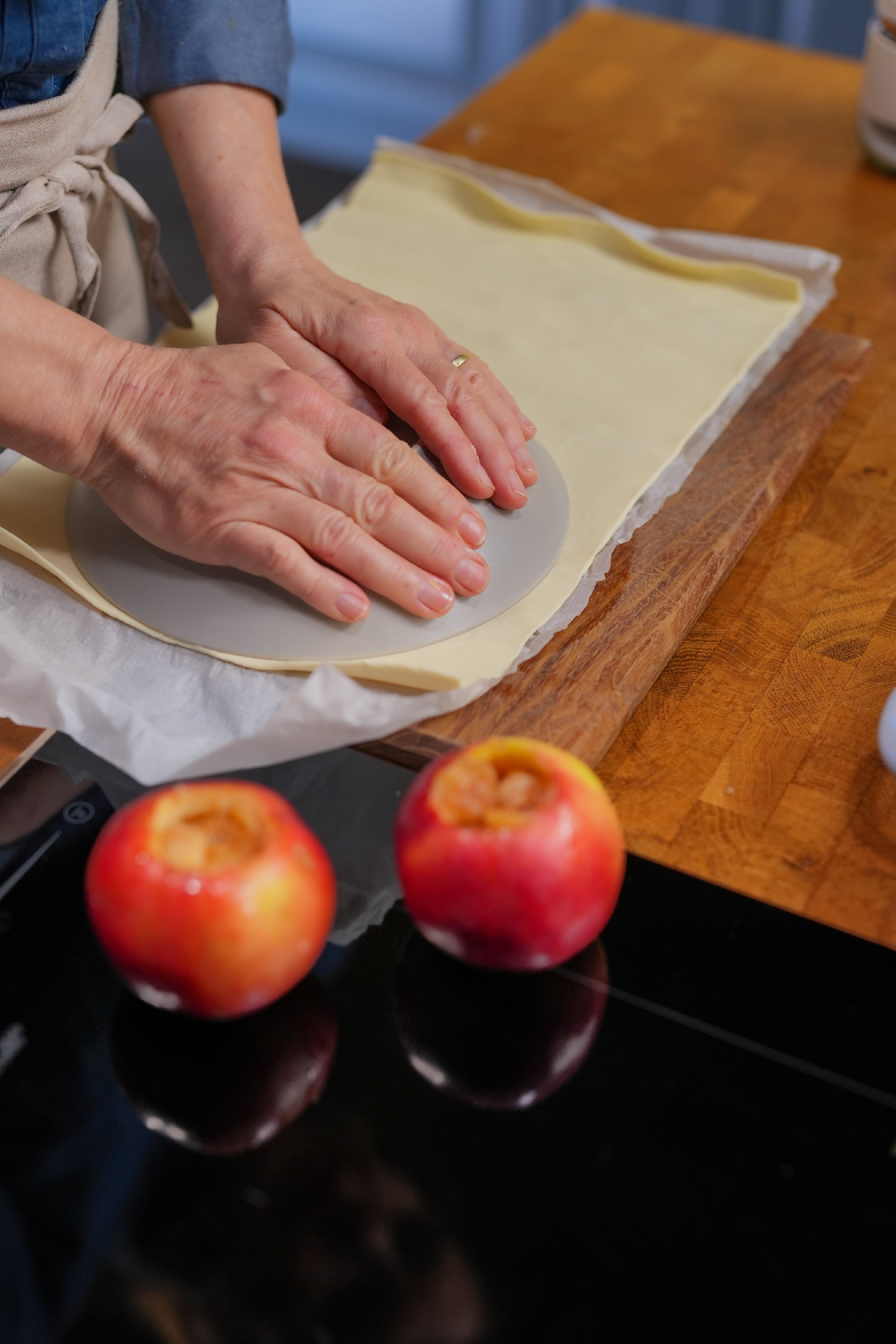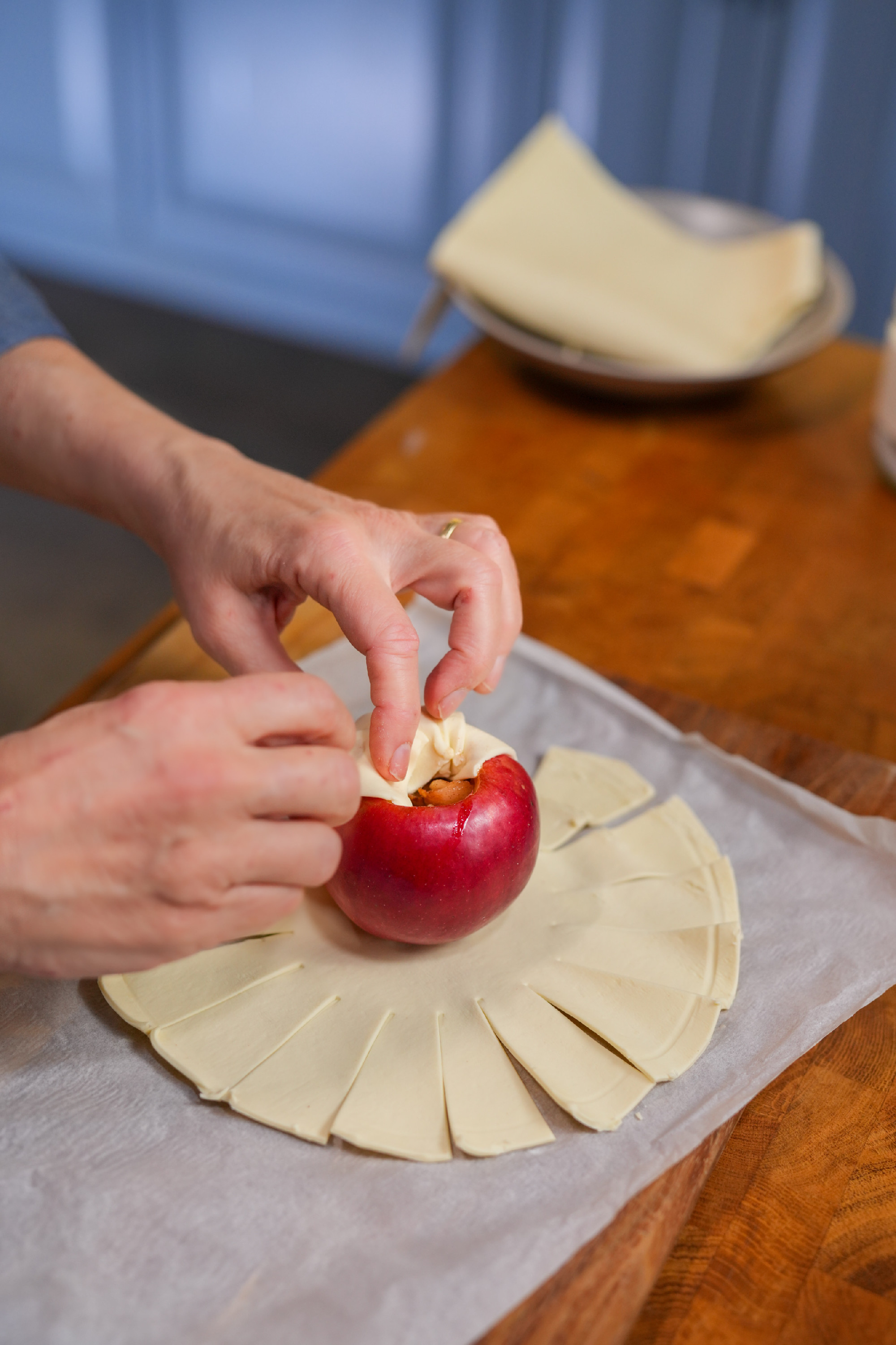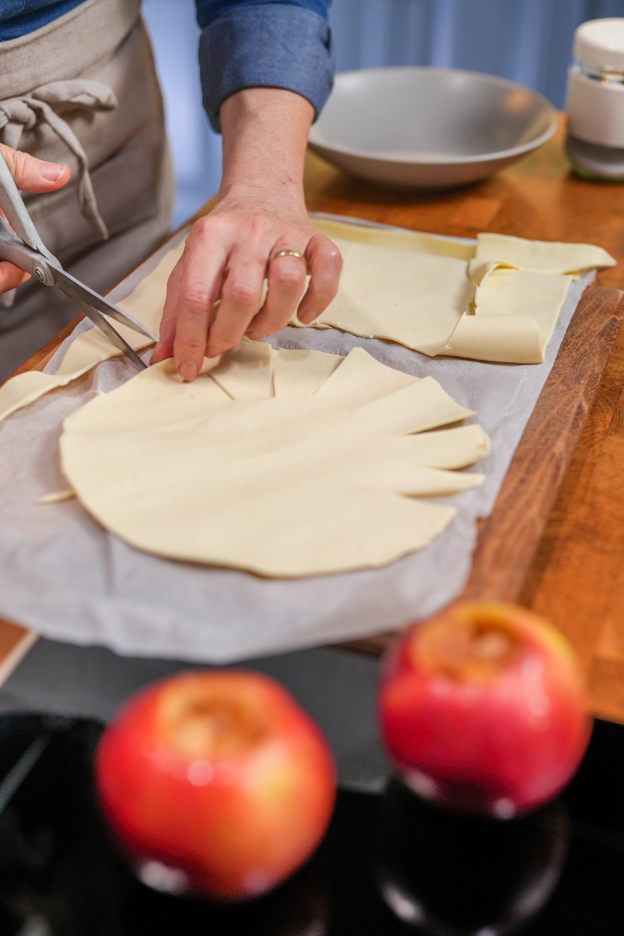 A leveles tésztát kinyújtjuk, majd akkora köröket vágunk belőle, hogy az almákat be tudjuk burkolni. A tésztakörök közepére ültetjük az almákat, majd a tésztát sugárirányban bevágjuk. A csíkokat szépen körben felhajtogatjuk az almákra.