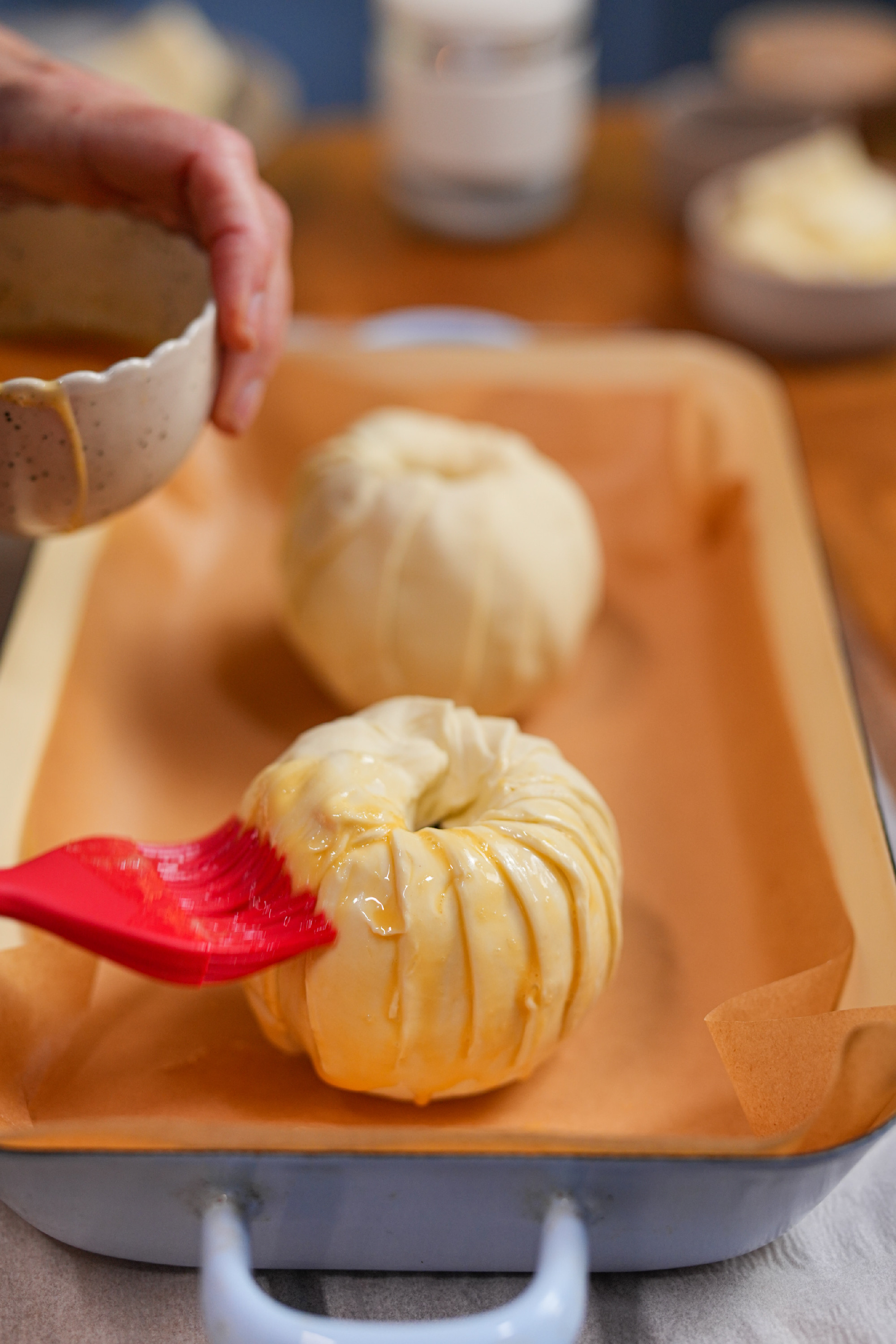 A tetejüket felvert tojással lekenjük. 190–200 °C-ra előmelegített sütőben addig sütjük, amíg a tészta szép aranybarnára pirul.