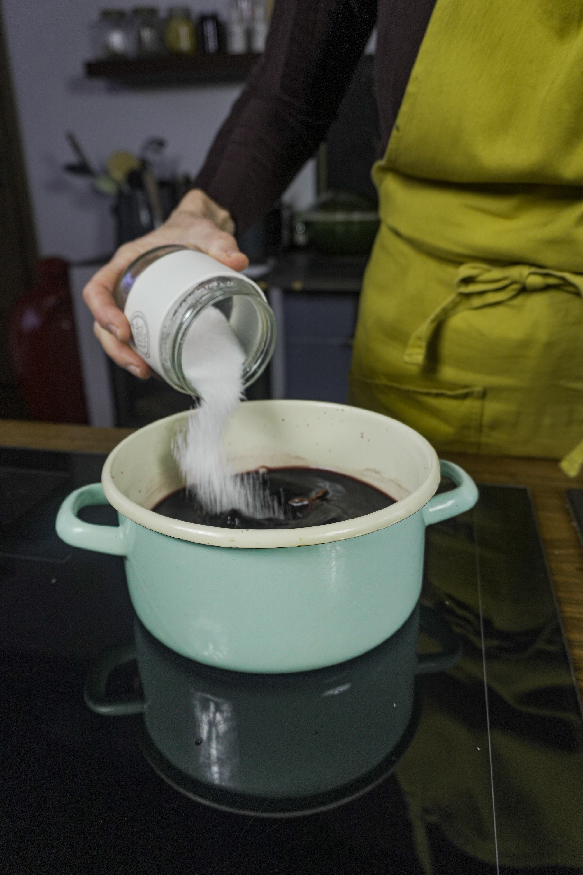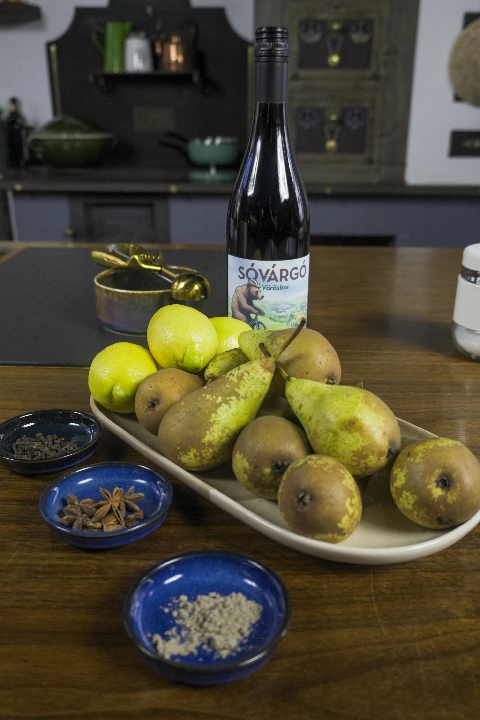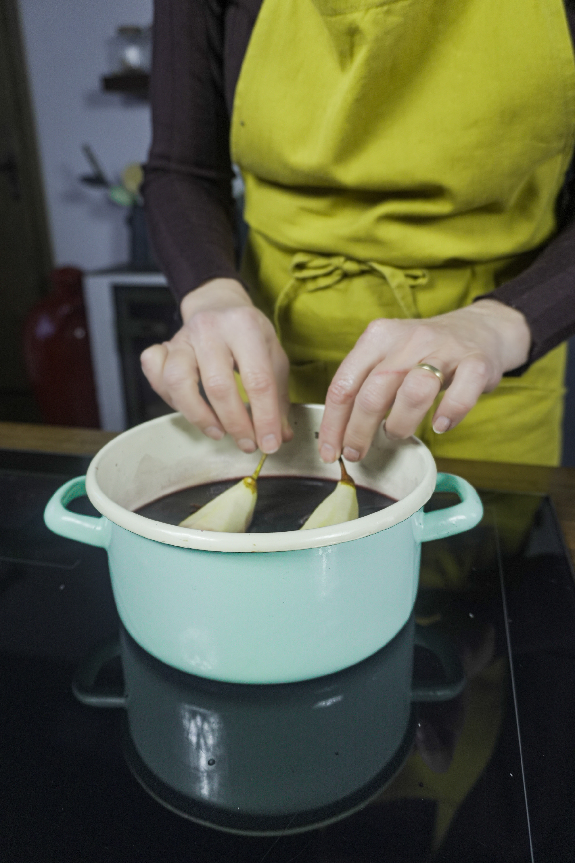 A körtéket meghámozzuk úgy, hogy a szárukat nem vágjuk le. Mindegyik gyümölcsből kivágjuk az alsó, kemény részt. Ezután egy magasabb falú lábasba öntjük a vörösbort. Hozzáadjuk a fűszereket és a cukrot, majd alaposan elkeverjük. Beletesszük a körtéket is, majd addig forraljuk, míg a körték szép színt kapnak a vörösbortól, és át is párolódnak. Figyeljünk, hogy ne főzzük szét őket, maradjanak egyben. Körülbelül 8-10 perc főzés elég is lesz nekik.