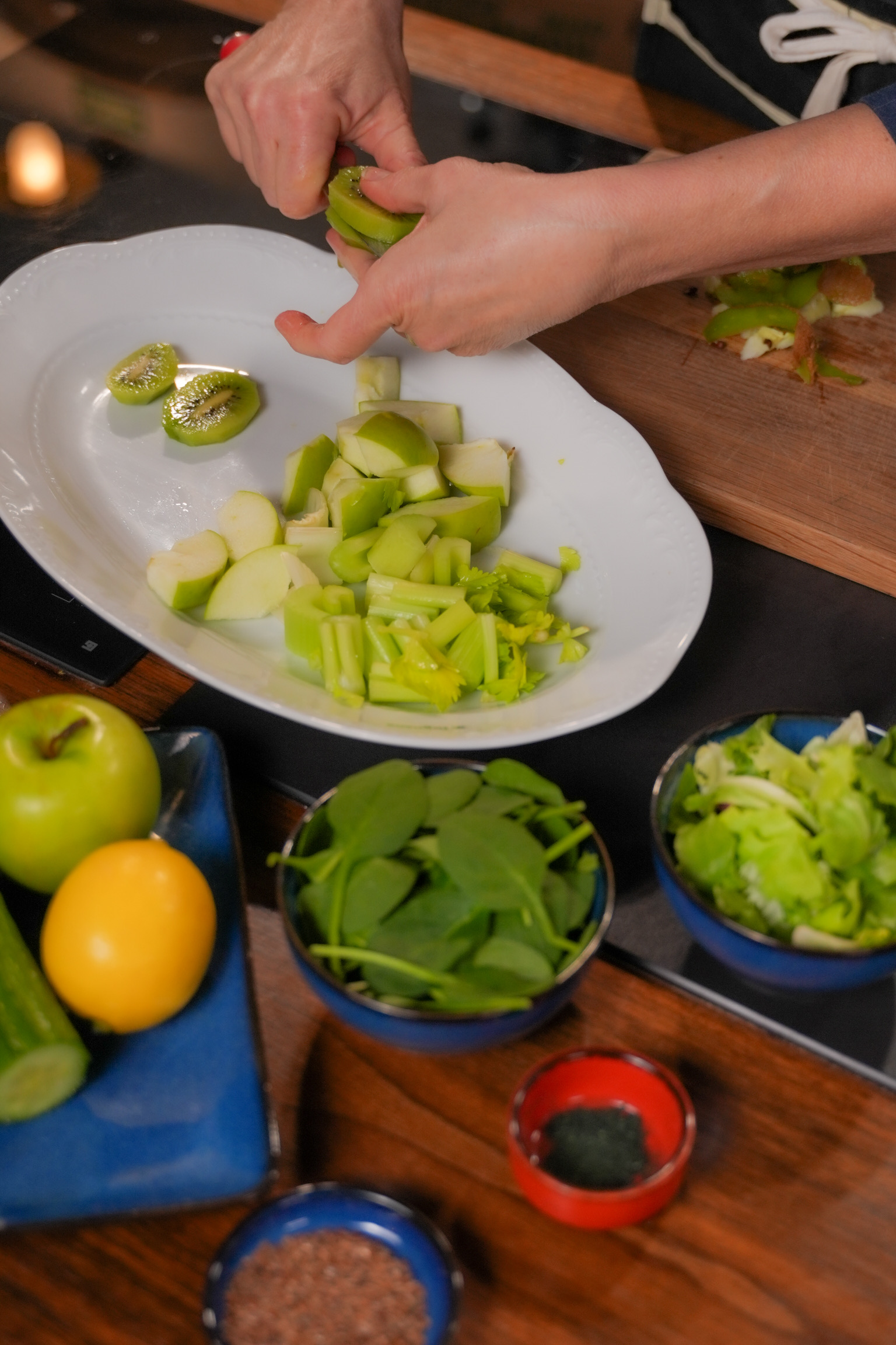 A turmixokhoz a hozzávalókat megtisztítjuk, ha szükséges, meghámozzuk, és feldaraboljuk. A turmixgép kelyhébe rakjuk a friss zöldségeket és gyümölcsöket, majd összeturmixoljuk. Ebben az esetben nem kell tökéletesen krémesre, maradjanak az italban rostok. Annyi vizet adjunk hozzá, hogy krémes, sűrű, de iható állaga legyen. Ha szeretnénk egy kicsit édesíteni, adhatunk hozzá mézet, vagy akár néhány szem datolyát is.