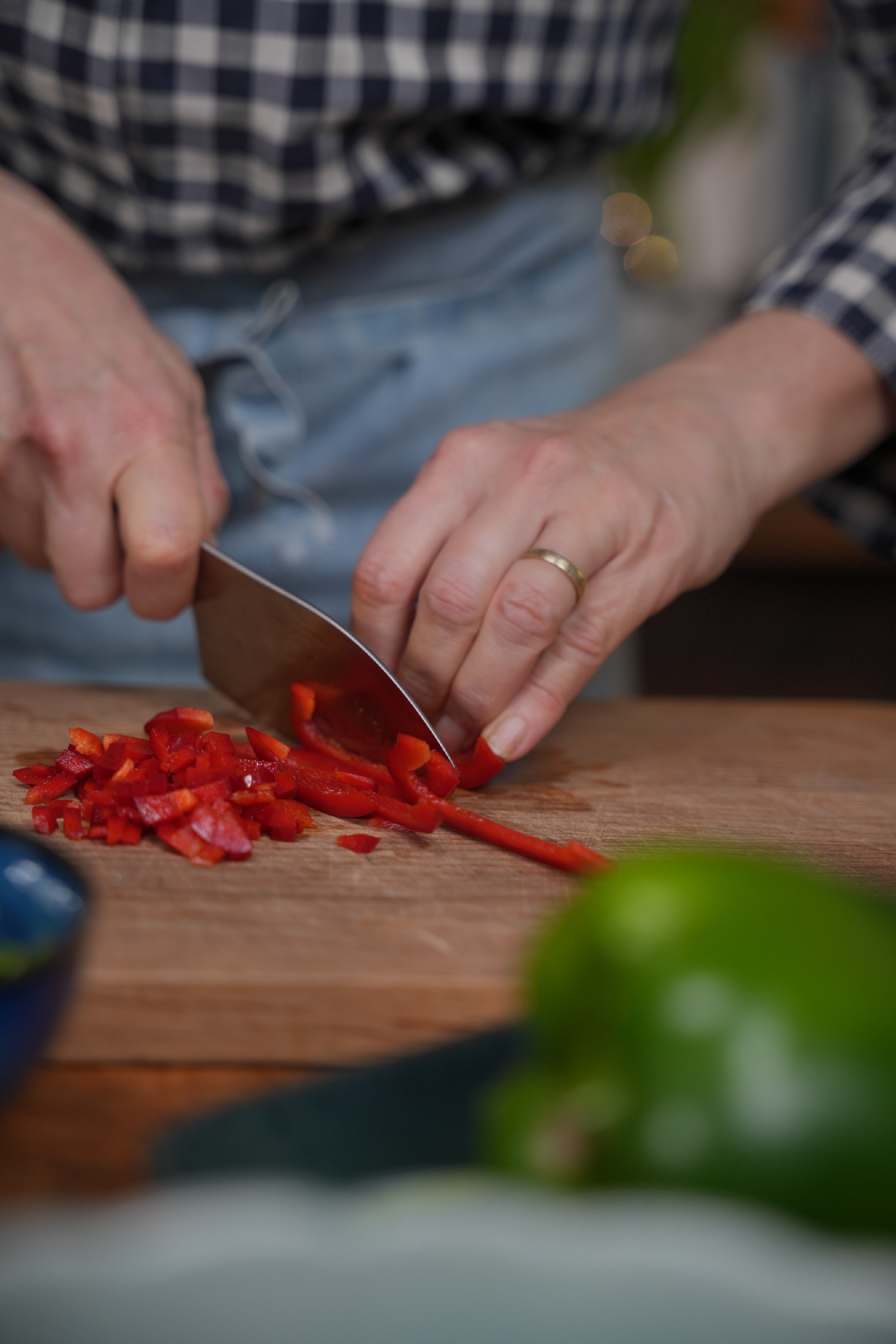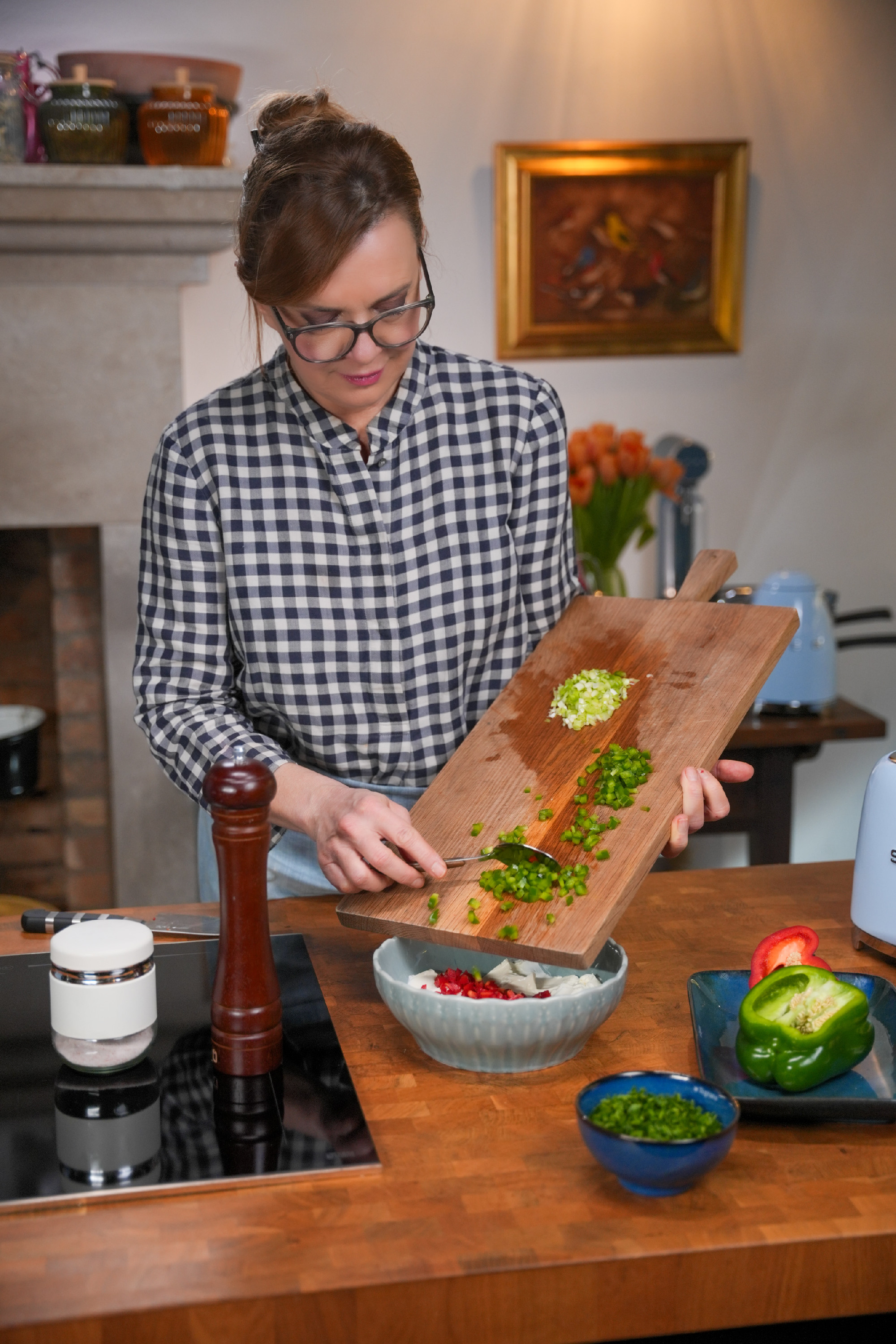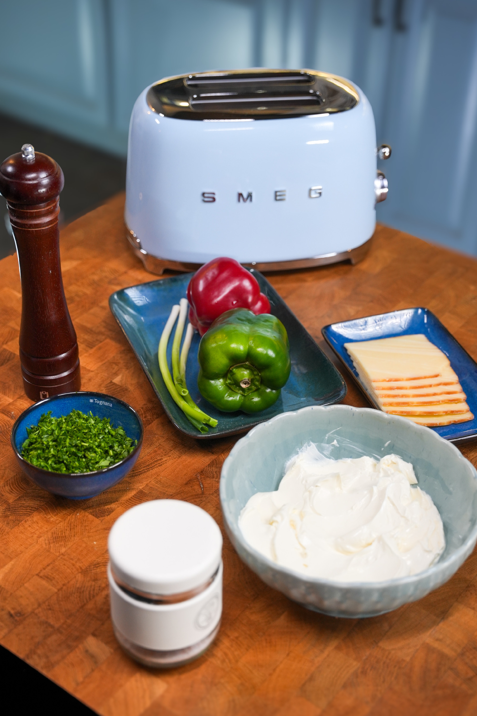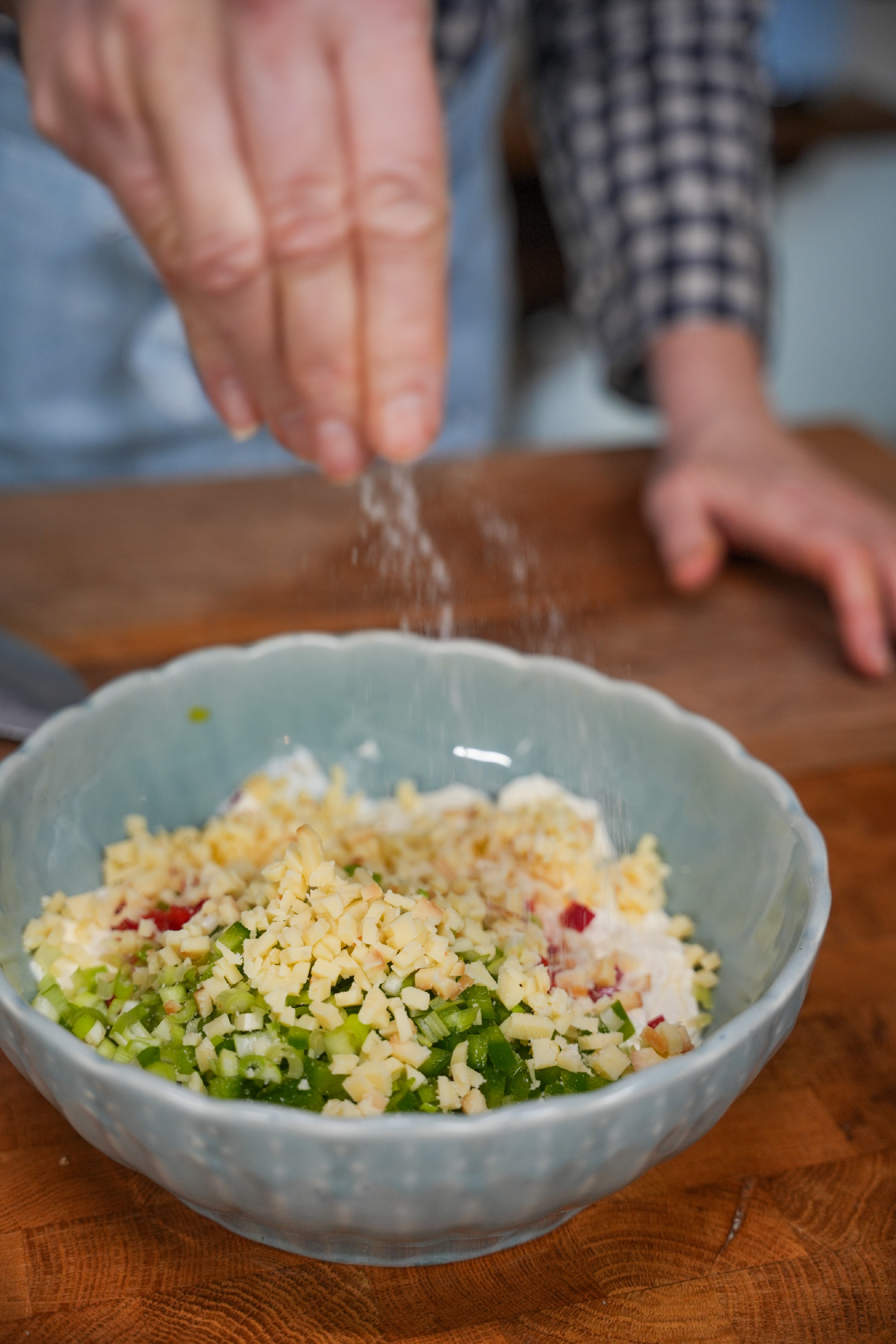 A kaliforniai paprikákat apró kockákra vágjuk, az újhagymát finomra aprítjuk. Alaposan összedolgozzuk a krémsajtot és a feldarabolt cheddart. Hozzáadjuk az előkészített zöldségeket, majd sózzuk, borsozzuk. Krémes, de jól formázható masszát keverünk.