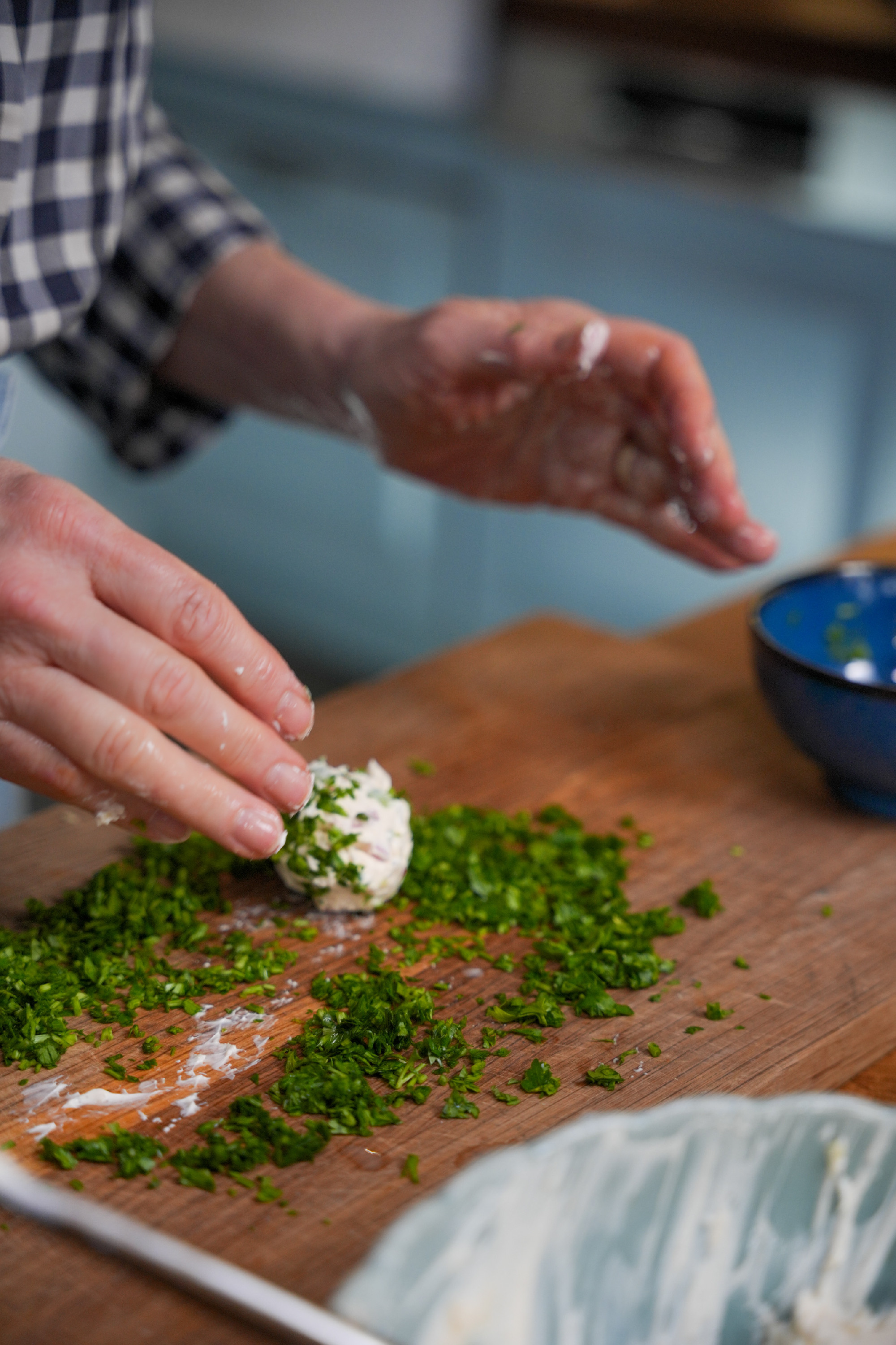 A petrezselymet finomra felvágjuk, majd egy deszkára szórjuk. A sajtos keverékből evőkanálnyi adagokat szedünk, majd nedves kézzel golyót formázunk belőle. A felvágott petrezselyembe forgatjuk. Ezután legalább fél órára hűtőbe rakjuk, hogy szépen megdermedjen. Pirítóssal tálaljuk.